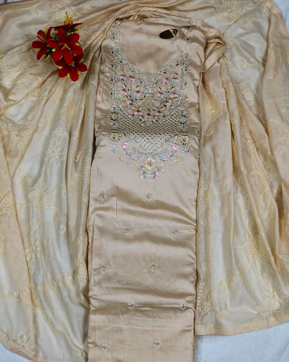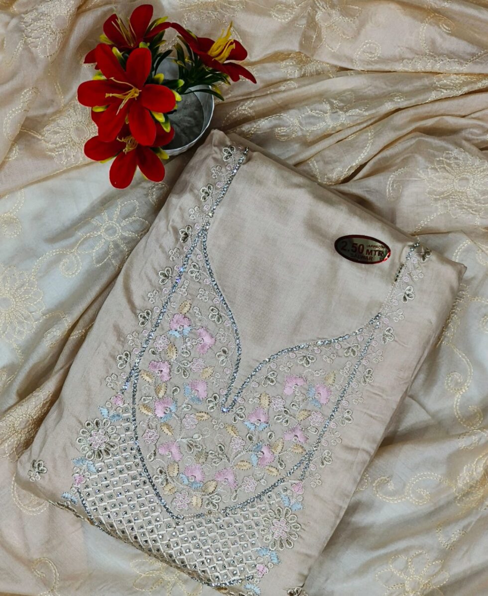 Be the first to review “Elegant Beige and Pastel Embroidered Unstitched Chanderi Suit Set”