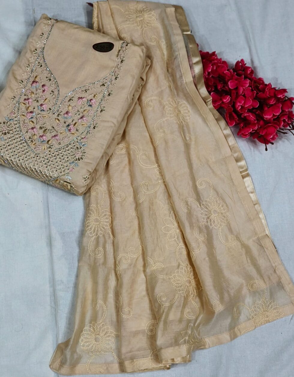Elegant Beige and Pastel Embroidered Unstitched Chanderi Suit Set