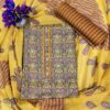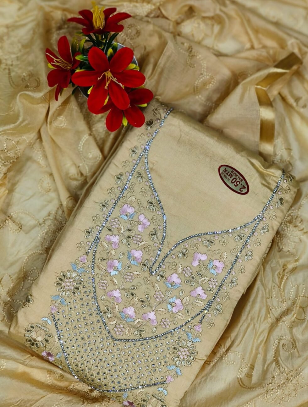 Drape yourself in the quiet luxury of our elegant Beige and Pastel Embroidered Unstitched Chanderi Silk Suit Set. This exquisite ensemble is a perfect choice for sophisticated festive gatherings, special occasions, and semi-formal events, offering a blend of traditional craftsmanship and contemporary style. The main kurti fabric is crafted from premium Chanderi Silk or a similar blend, providing a beautiful natural sheen and a soft, luxurious feel. The key highlight is the elaborate, V-shaped heavy embroidery and embellishment adorning the neckline. This intricate work features delicate floral motifs stitched in soft pastel shades of pink, blue, and yellow, beautifully framed by shimmering silver threadwork, sequins, or small stones. The embellishment extends down the chest area in a geometric pattern, adding a rich, dimensional focal point to the kurti. The neutral beige colour of the fabric provides a versatile base that allows the pastel embroidery to truly stand out. The set includes coordinating fabric for the bottom and likely a matching dupatta (though only the kurti is fully visible). The dupatta is often made from a fabric that complements the sheen of the kurti, possibly with subtle self-weaves or minimal border detailing. This designer unstitched suit gives you the freedom to customize the fit, ensuring a perfectly tailored and high-end finished garment that exudes effortless grace.