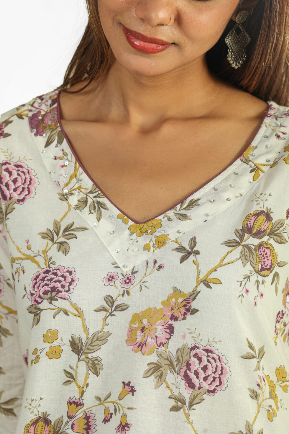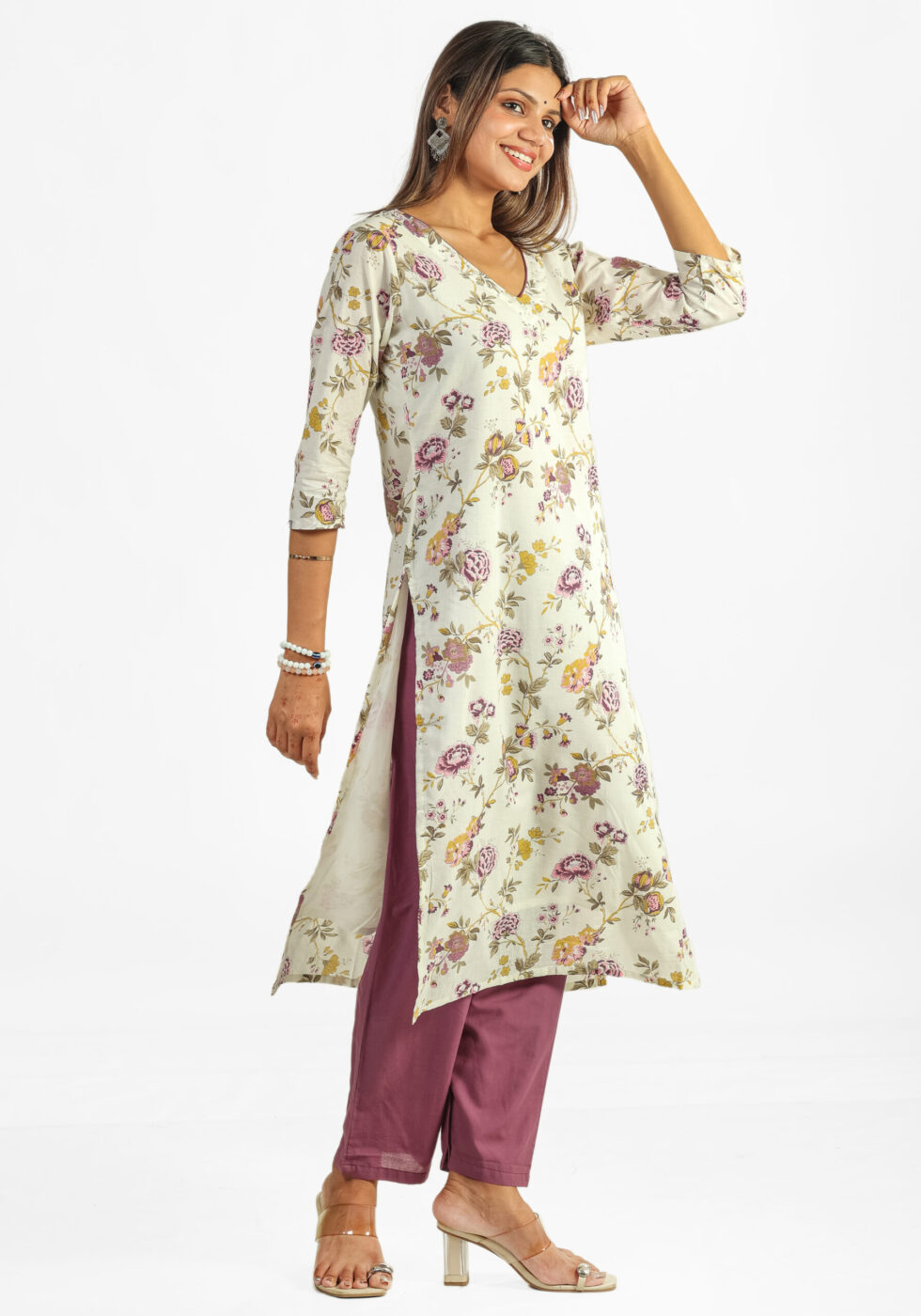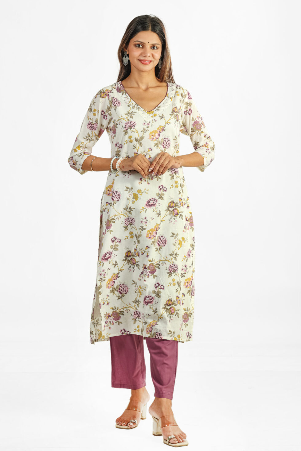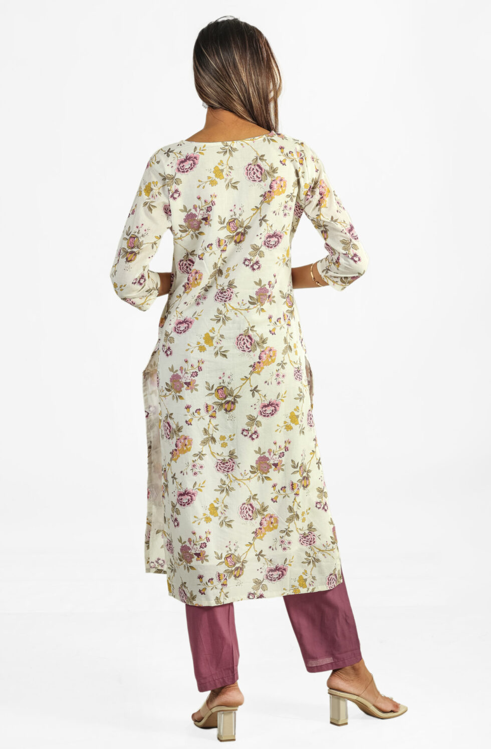 Elevate your ethnic wardrobe with our exquisite Floral Printed Cotton Kurta Set, a perfect blend of tradition and contemporary style. The set includes a straight-cut, three-quarter sleeve kurta adorned with a sophisticated all-over floral print in muted tones of pink, yellow, and green on a cream base, featuring an elegant V-neckline. It is thoughtfully paired with comfortable, solid-colored cotton blend pants in a trendy mauve or dusty pink hue, providing a beautiful contrast.