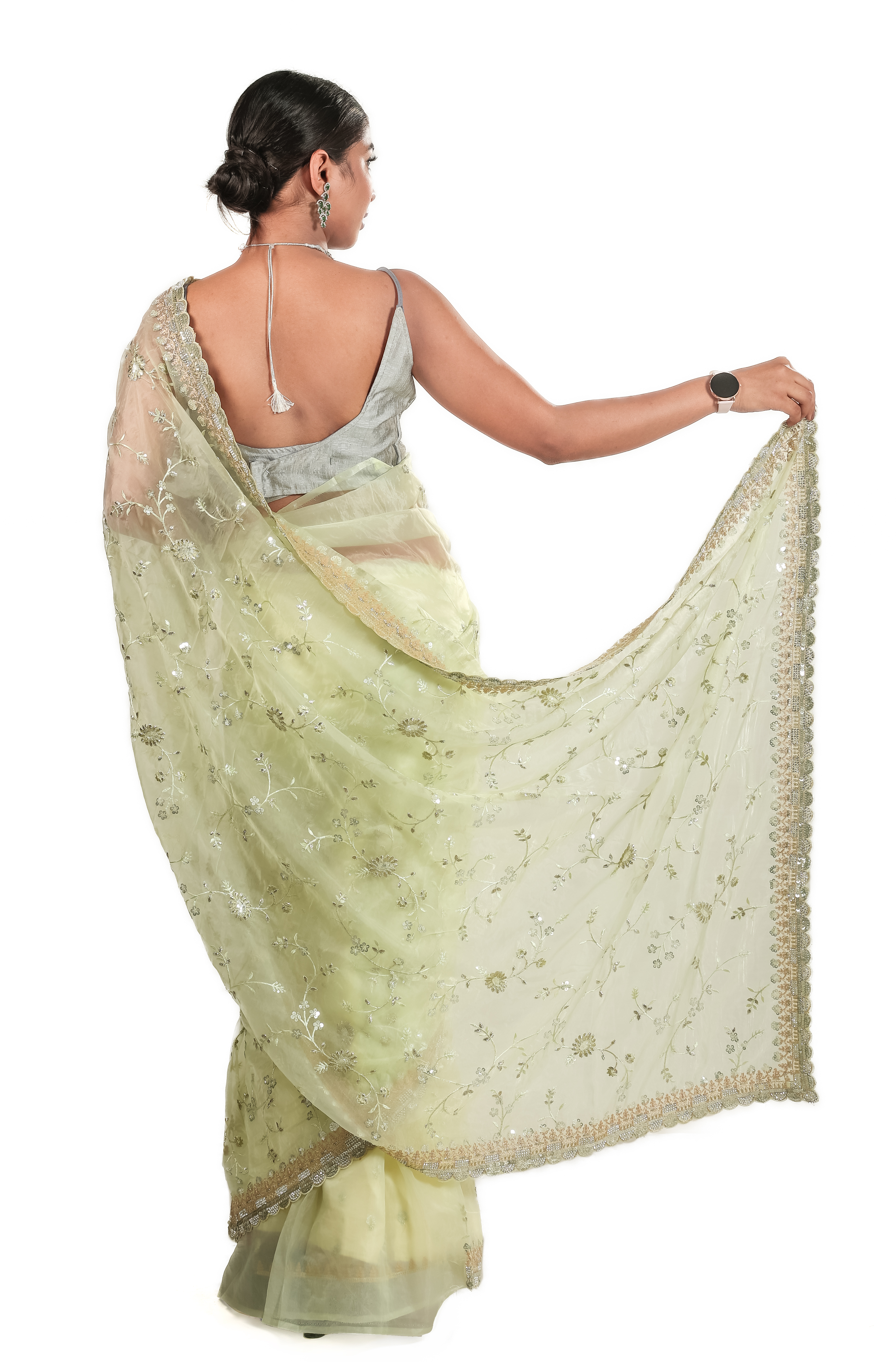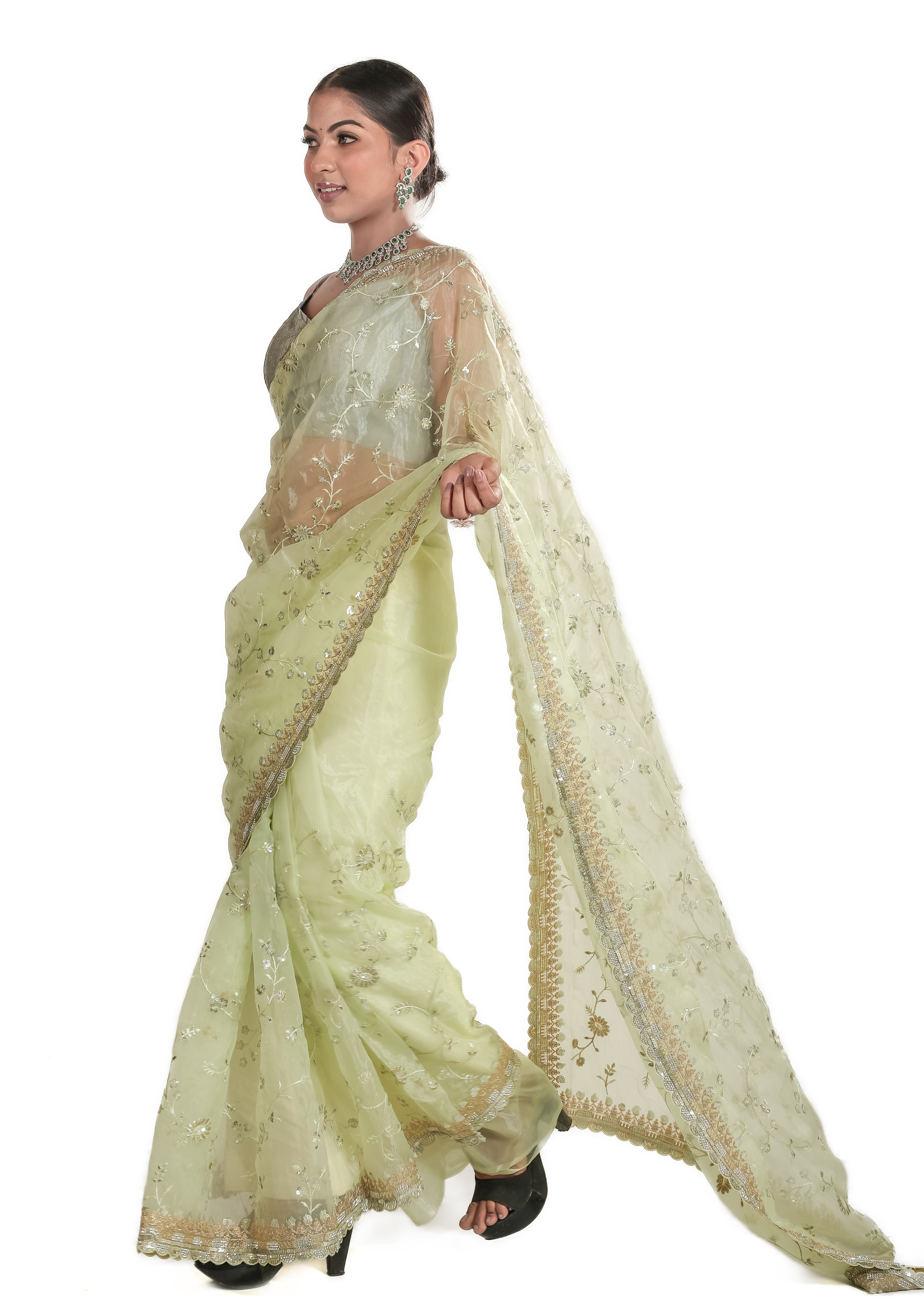 Elevate your festive and wedding wardrobe with this stunning Light Green Designer Net Saree, beautifully crafted with intricate thread embroidery, shimmering sequins, and mirror work detailing. The soft, lightweight net fabric drapes effortlessly, giving you an elegant and refined silhouette. Its delicately embellished border adds a luxurious charm, making it perfect for weddings, receptions, festivals, engagement ceremonies, sangeet nights, and special occasions. The pastel green shade brings a refreshing and sophisticated appeal, ideal for women who prefer graceful and modern ethnic style. Pair it with statement jewelry to complete a glamorous, head-turning look. This saree is a must-have addition for anyone seeking premium-quality designer ethnic wear.