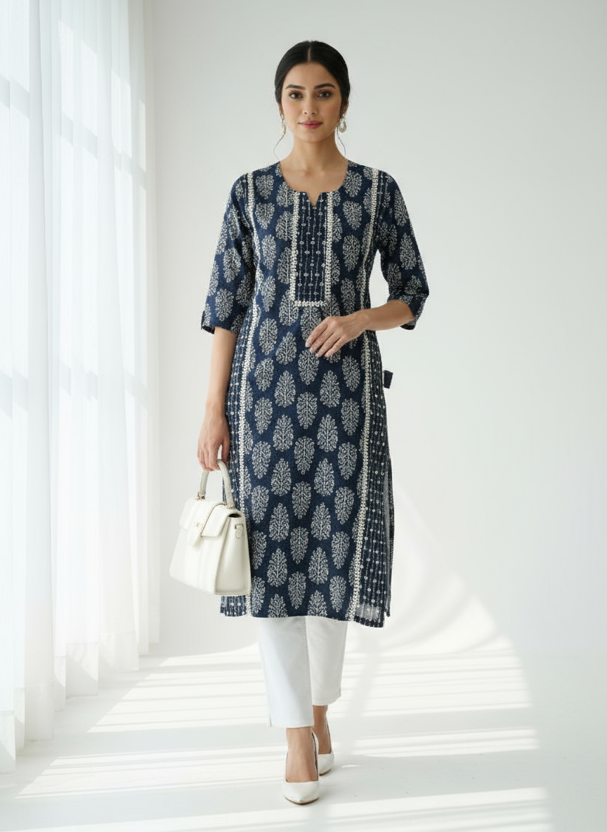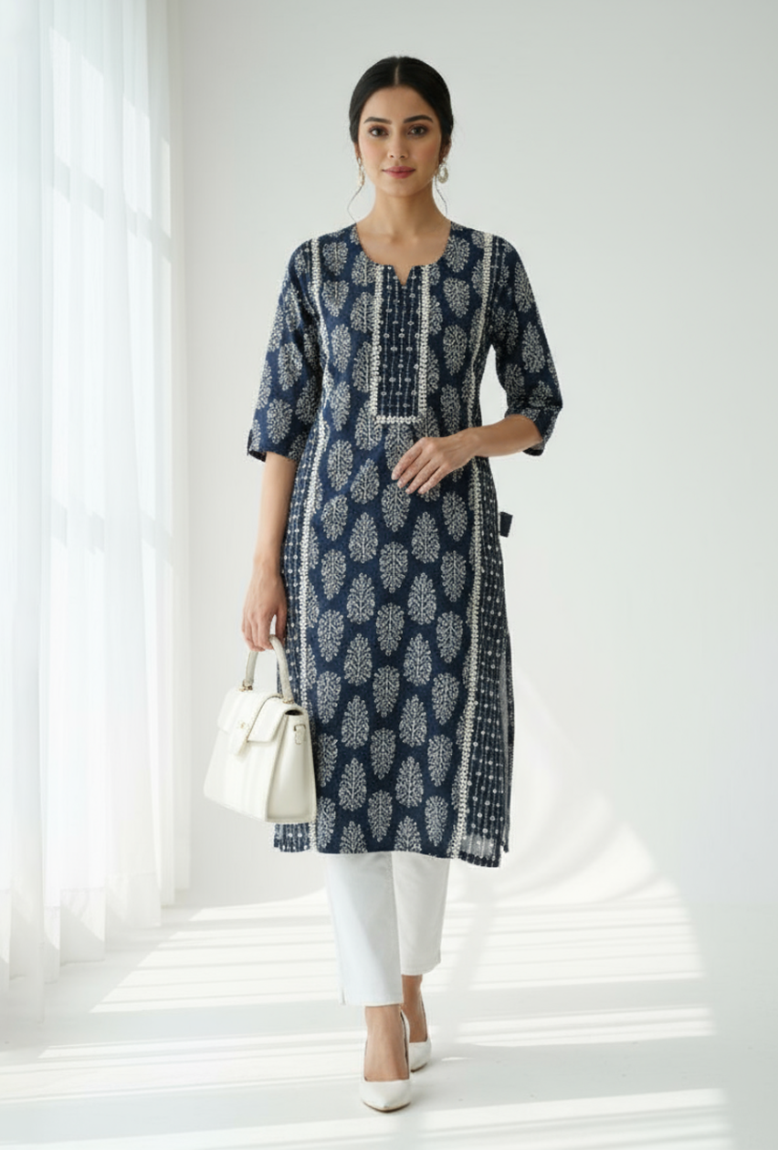Step into timeless elegance with this Elegant Navy Blue Printed Cotton Kurti for Women, a perfect blend of traditional charm and modern sophistication. Crafted from premium-quality cotton fabric, this kurti ensures all-day comfort with its soft, breathable texture, making it ideal for both office wear and casual outings.