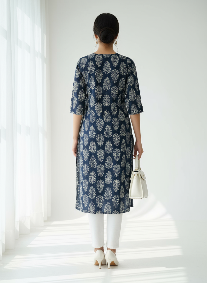 Elegant Navy Blue Printed Cotton Kurti for Women – Office & Casual Wear