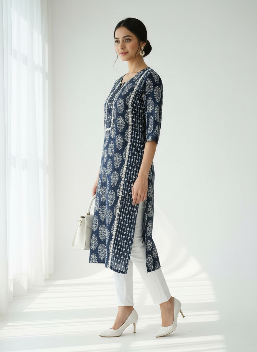 The kurti features an exquisite white ethnic print on a deep navy blue base, creating a beautiful contrast that enhances your overall look. Its straight-cut silhouette flatters all body types, offering a perfect balance of comfort and style. The three-quarter sleeves, round neckline with button detailing, and side slits add subtle elegance to this everyday essential.