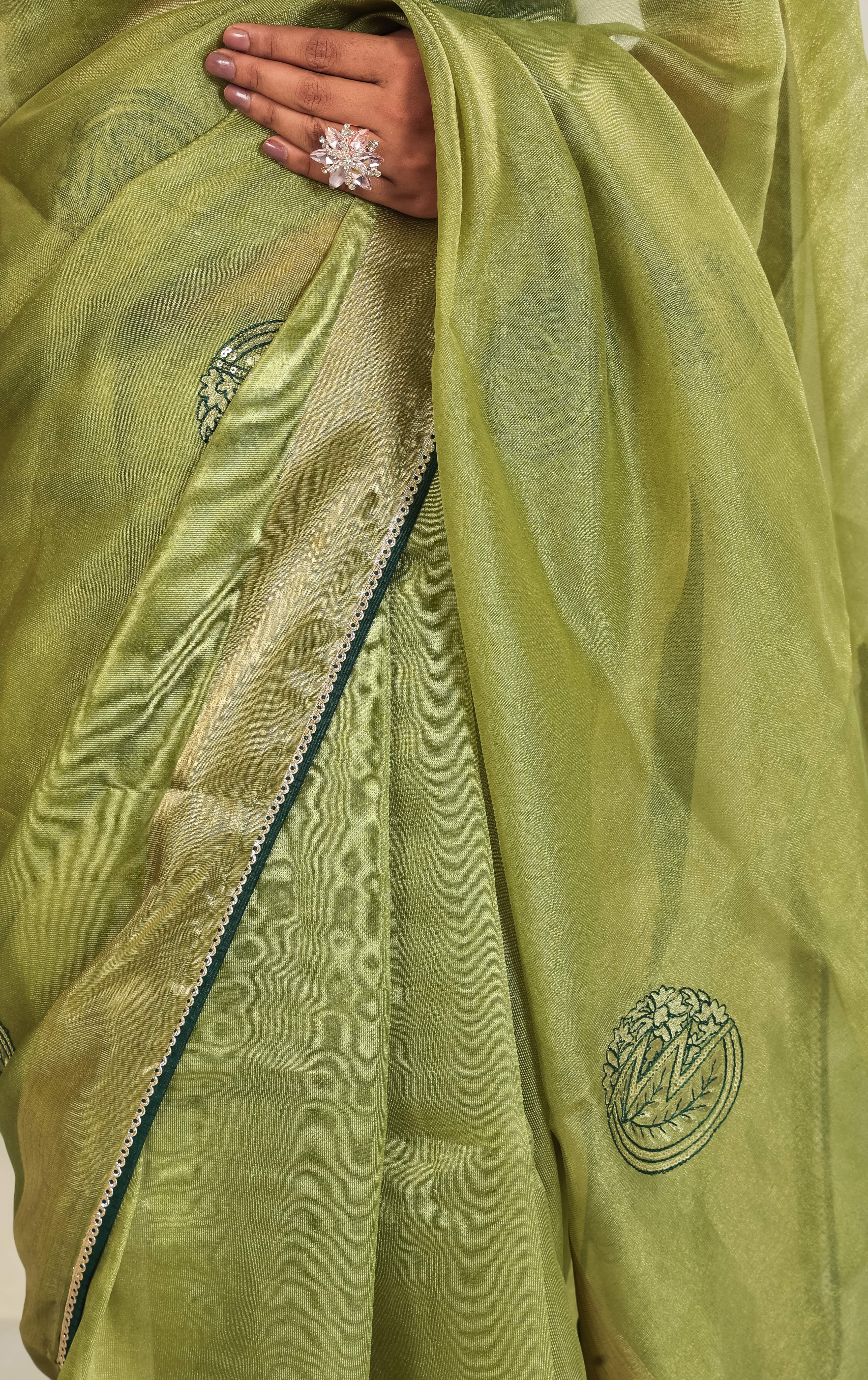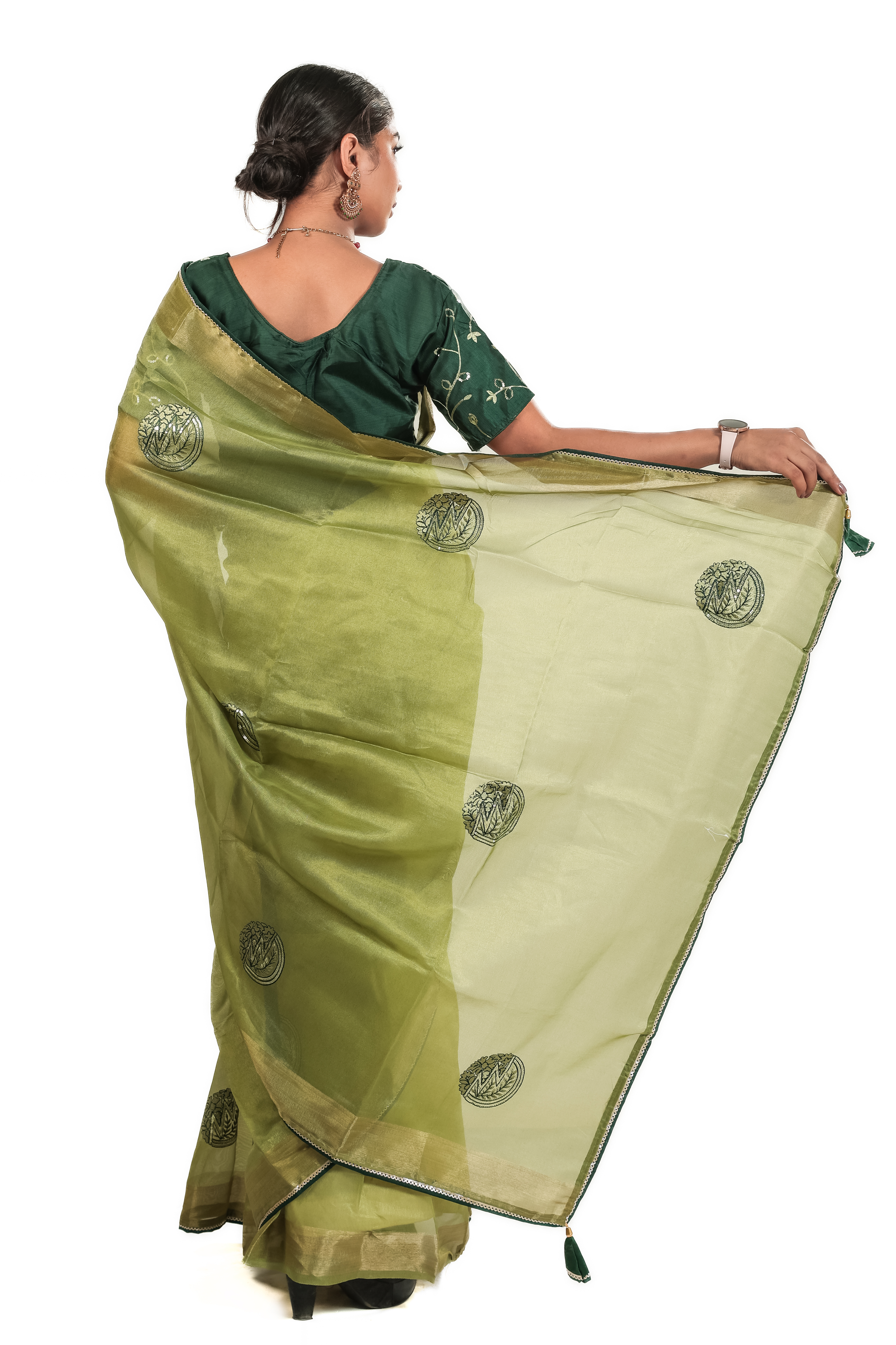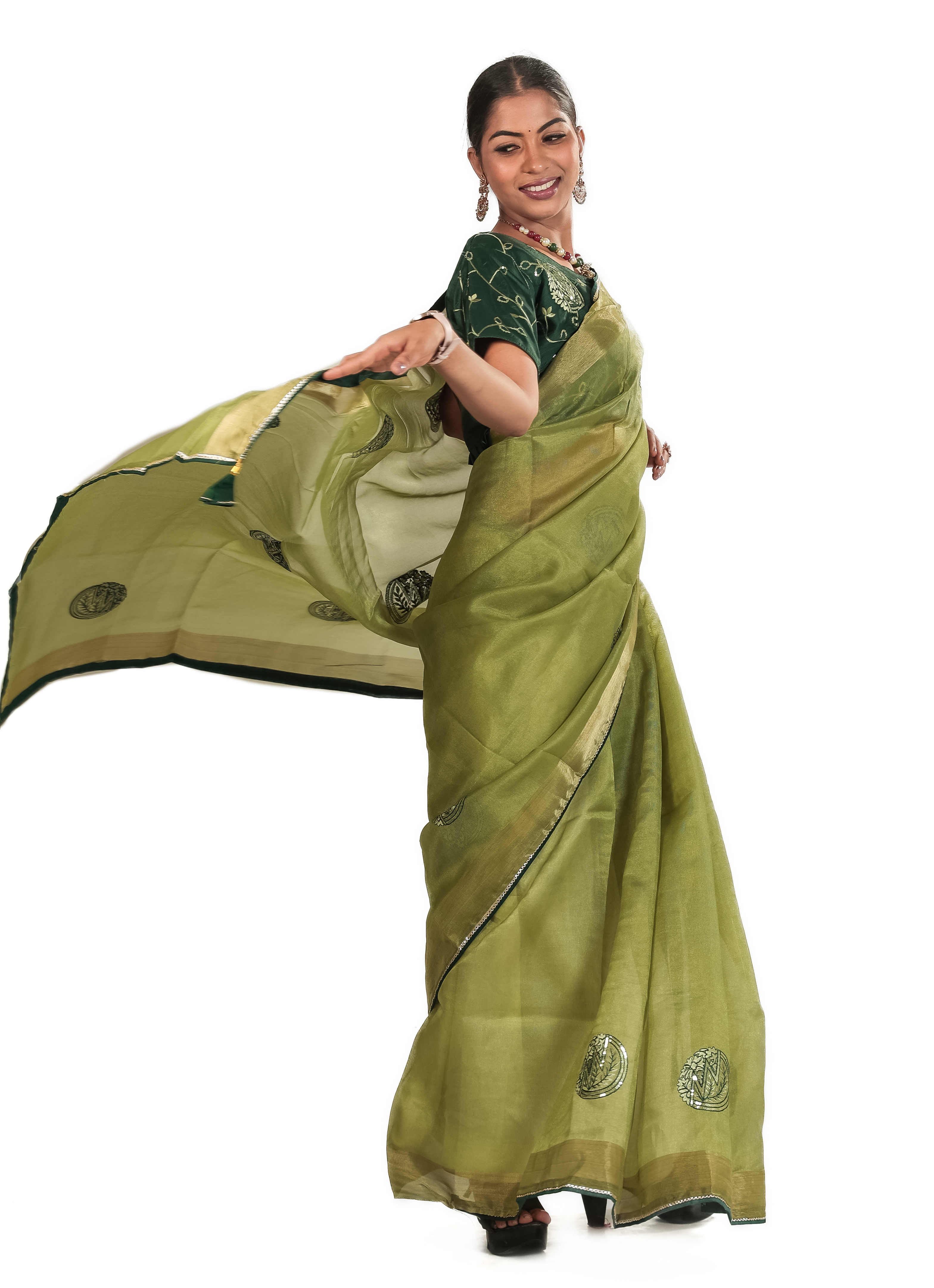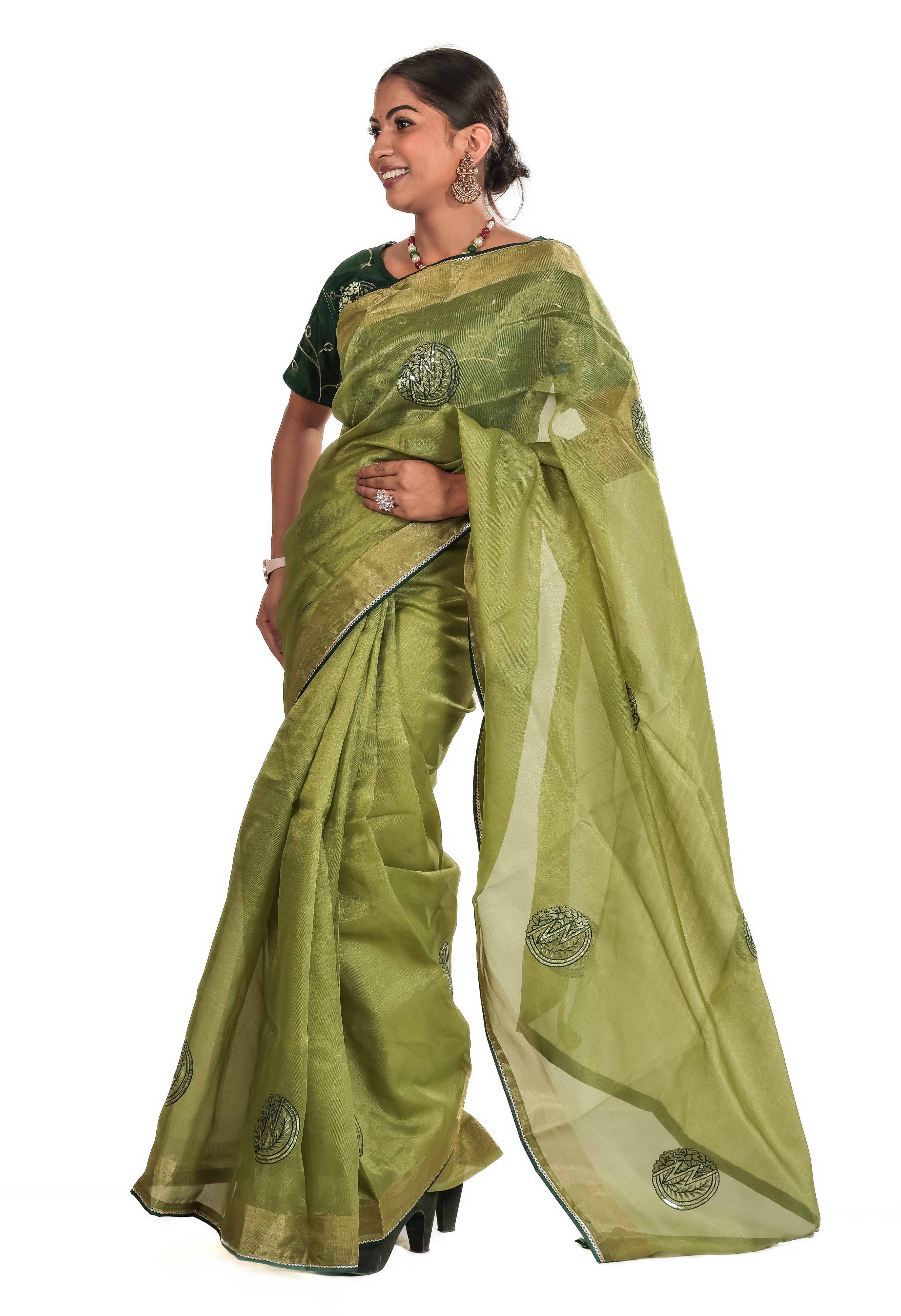 This elegant Olive Green Organza Saree is designed for women who love lightweight, stylish, and classy ethnic wear. Crafted from premium organza fabric, the saree features beautifully embroidered circular motifs that add a delicate touch to its overall appearance. Its soft shine, smooth drape, and modern color make it a perfect choice for festive occasions, weddings, receptions, office celebrations, and family gatherings. The saree comes with a matching embroidered blouse that enhances its sophisticated look and ensures a complete, graceful outfit. The comfortable fabric makes it easy to carry throughout the day while maintaining a rich, fashionable style. Whether you are attending a traditional event or simply want to elevate your ethnic wardrobe, this saree offers the perfect blend of charm, comfort, and elegance. Ideal for women who prefer timeless, premium-quality designer wear.
