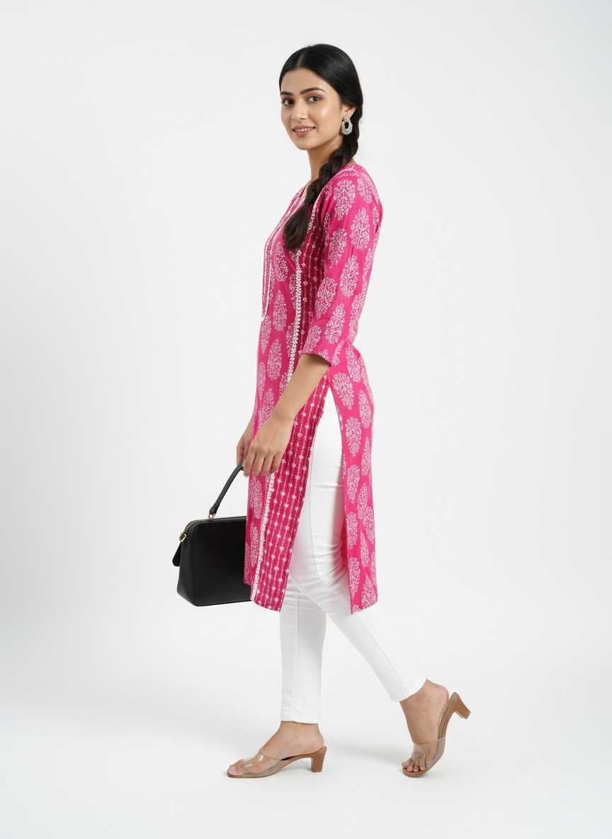 Enhance your ethnic wardrobe with this Elegant Pink Printed Cotton Kurti for Women, crafted to bring together style, comfort, and versatility. Made from 100% premium cotton fabric, this kurti ensures all-day comfort, making it ideal for office, college, and casual outings. The beautiful pink base is adorned with intricate white block prints, giving it a sophisticated yet vibrant appeal.