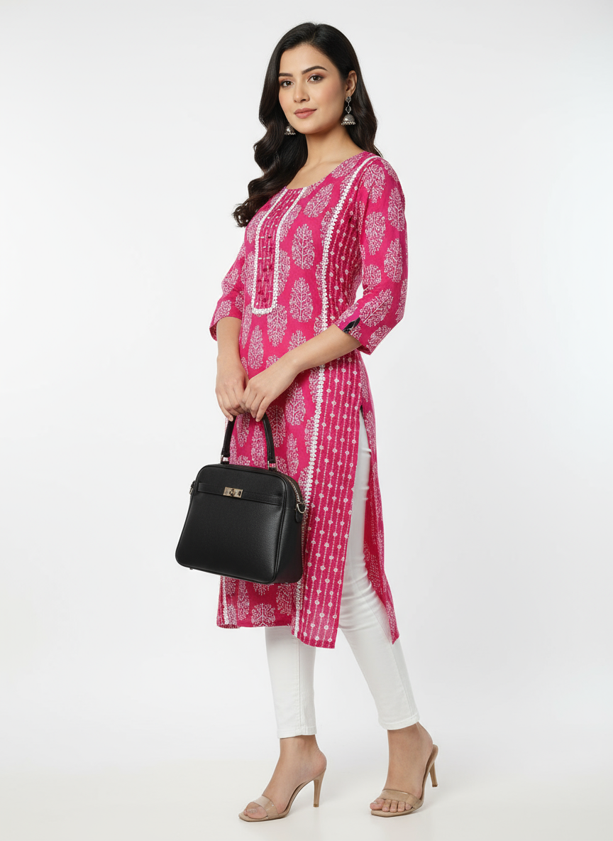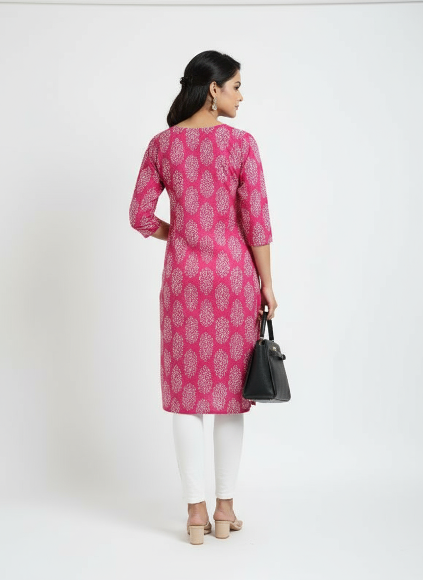 Whether you’re attending meetings, running errands, or going out with friends, this pink printed cotton kurti ensures you stay elegant and confident. The subtle design reflects a perfect balance of traditional charm and modern aesthetics, making it a must-have piece in every woman’s wardrobe.
