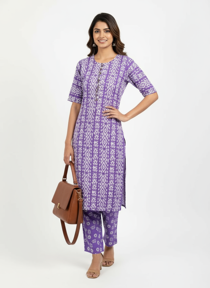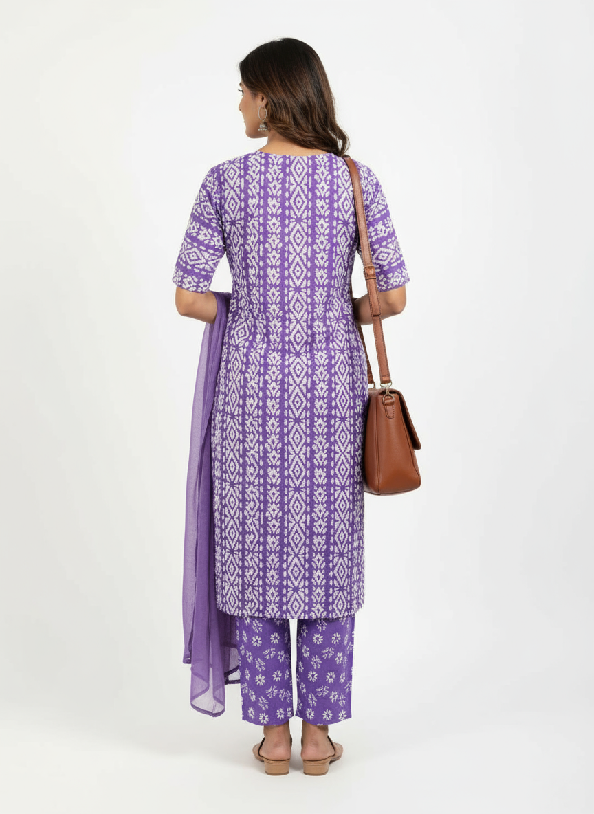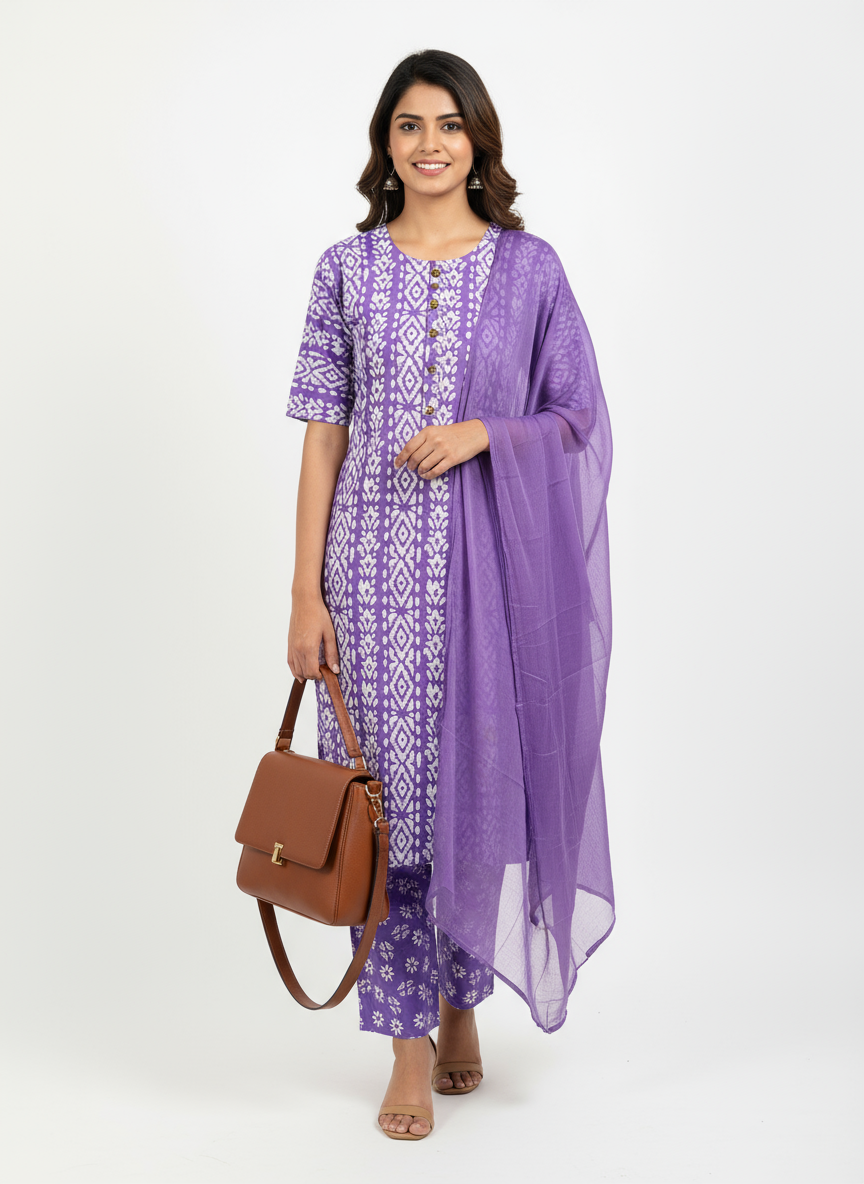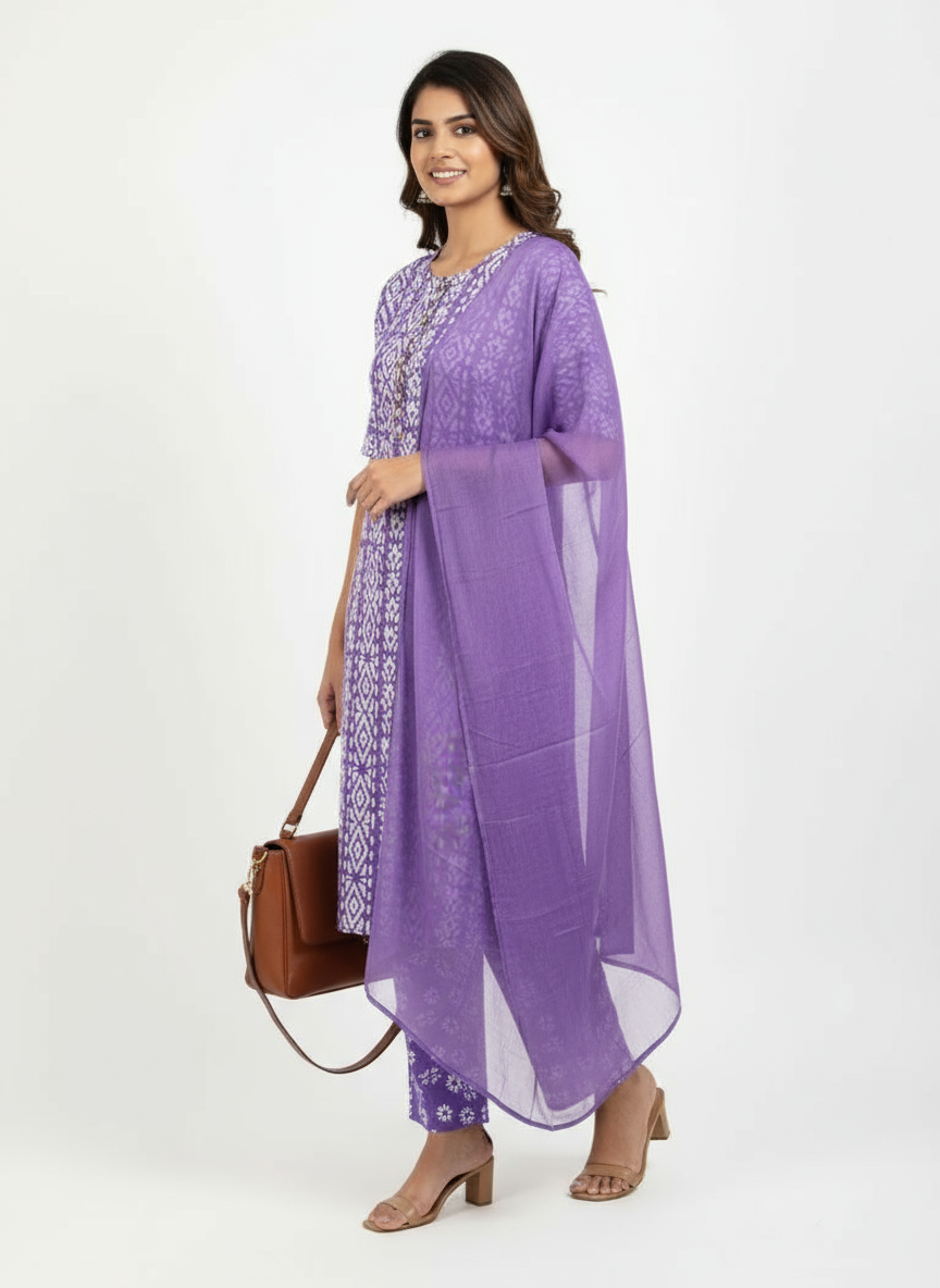 Elevate your ethnic wardrobe with our exquisite Lavender Purple and White Ikat Print Three-Piece Cotton Suit Set. This ready-to-wear ensemble offers the perfect blend of traditional appeal and modern comfort, making it a highly desirable choice for any occasion. The high-quality, breathable pure cotton fabric ensures maximum comfort for all-day wear, especially in warmer climates. The set includes a straight-fit kurta featuring a striking Ikat-inspired geometric print in a vibrant lavender purple and crisp white combination. The kurta is designed with a neat neckline and comfortable three-quarter sleeves. Complementing the kurta are the straight-cut pants, which feature a subtly different, all-over floral or stylized print that harmonizes beautifully with the main print. These pants are also crafted from the same soft cotton for a relaxed and comfortable fit. Completing this beautiful ensemble is a soft, solid-colored chiffon or cotton dupatta in a matching shade of lavender purple, adding a touch of grace and lightness to the look. The addition of the dupatta transforms the two-piece set into a complete, traditional salwar suit, perfect for a slightly more formal feel without sacrificing comfort. This versatile set is an essential addition for those seeking stylish daily wear, sophisticated office wear, or a charming outfit for casual outings. Its striking color and timeless print make it a standout piece in any ethnic collection.