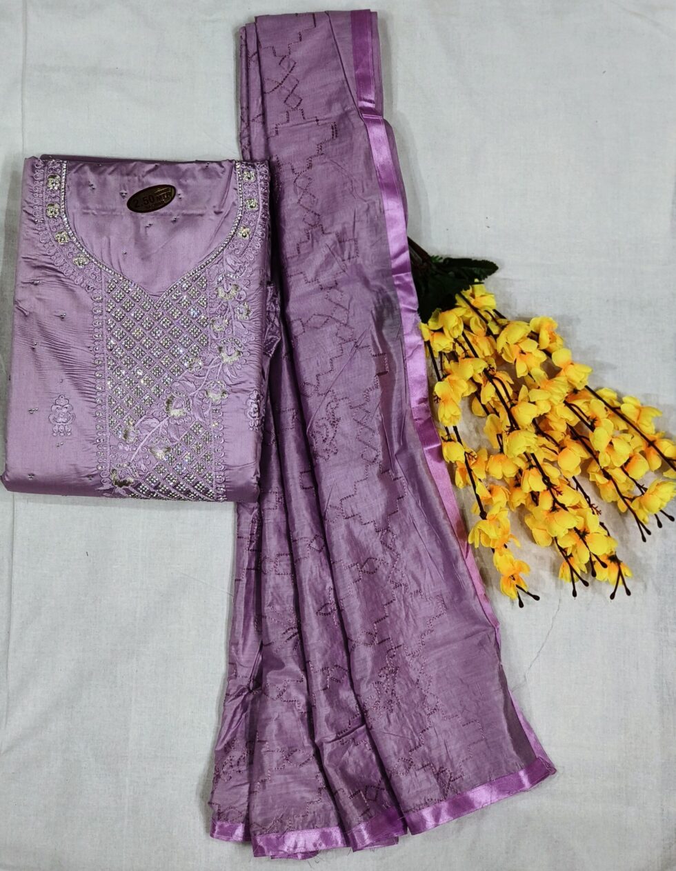 Be the first to review “Lavender Purple Embroidered Unstitched Chanderi Silk Suit Set with Geometric Dupatta”
