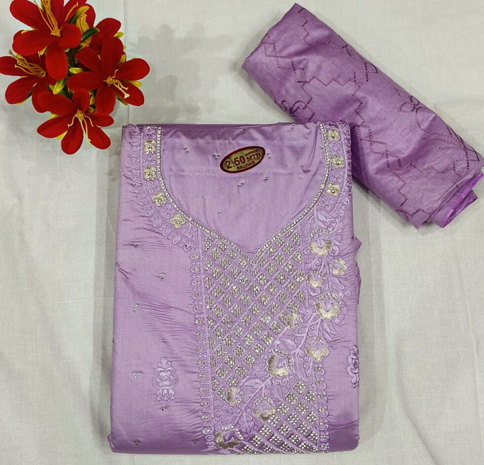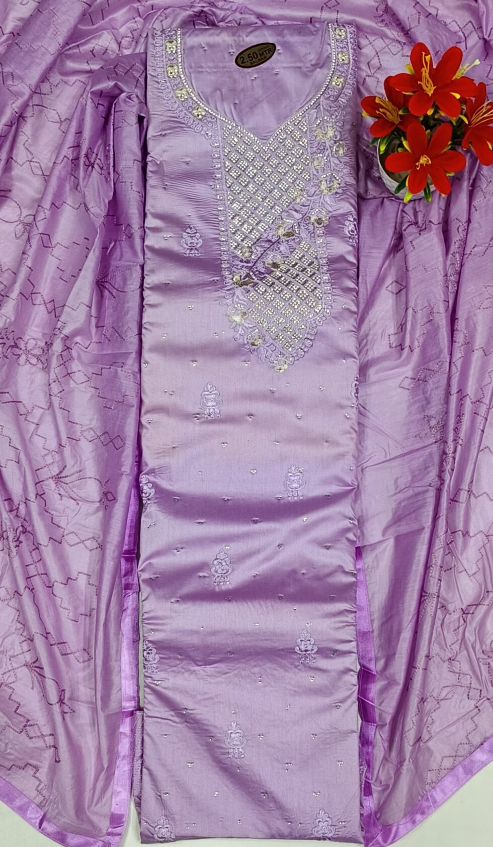 Drape yourself in the ethereal beauty of our Lavender Purple Embroidered Unstitched Chanderi Silk Suit Set. This luxurious three-piece ensemble is the perfect choice for festive gatherings, evening parties, and special occasions where you wish to make a sophisticated statement. The main kurti fabric is crafted from elegant Chanderi Silk or a similar blend, giving it a subtle sheen and a rich texture. The key highlight is the elaborate embroidery and embellishment work focused on the V-neckline panel. This detailed work, featuring small stones, sequins, or threadwork in silver or white, creates a stunning, regal focal point. The rest of the kurti fabric is elegantly finished with small, scattered embroidered motifs down the length, maintaining a balanced and refined aesthetic. The set includes a generous length of fabric for the bottom, likely a plain material in a matching or complementary tone, which can be tailored into comfortable trousers, churidar, or a salwar. Completing the opulent look is the matching tonal dupatta, which drapes beautifully and features a subtle, woven or self-coloured geometric pattern or texture throughout. The cohesive purple colour palette ensures a sophisticated, monochromatic appearance. This designer unstitched suit provides the freedom to customize the fit while offering a rich, ready-to-wear feel, making it an essential addition to any festive or wedding-wear collection.