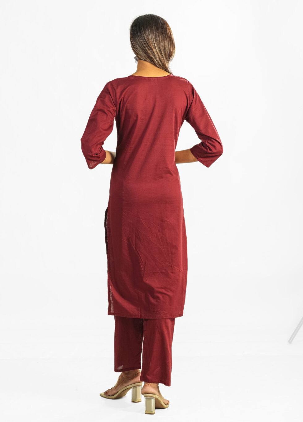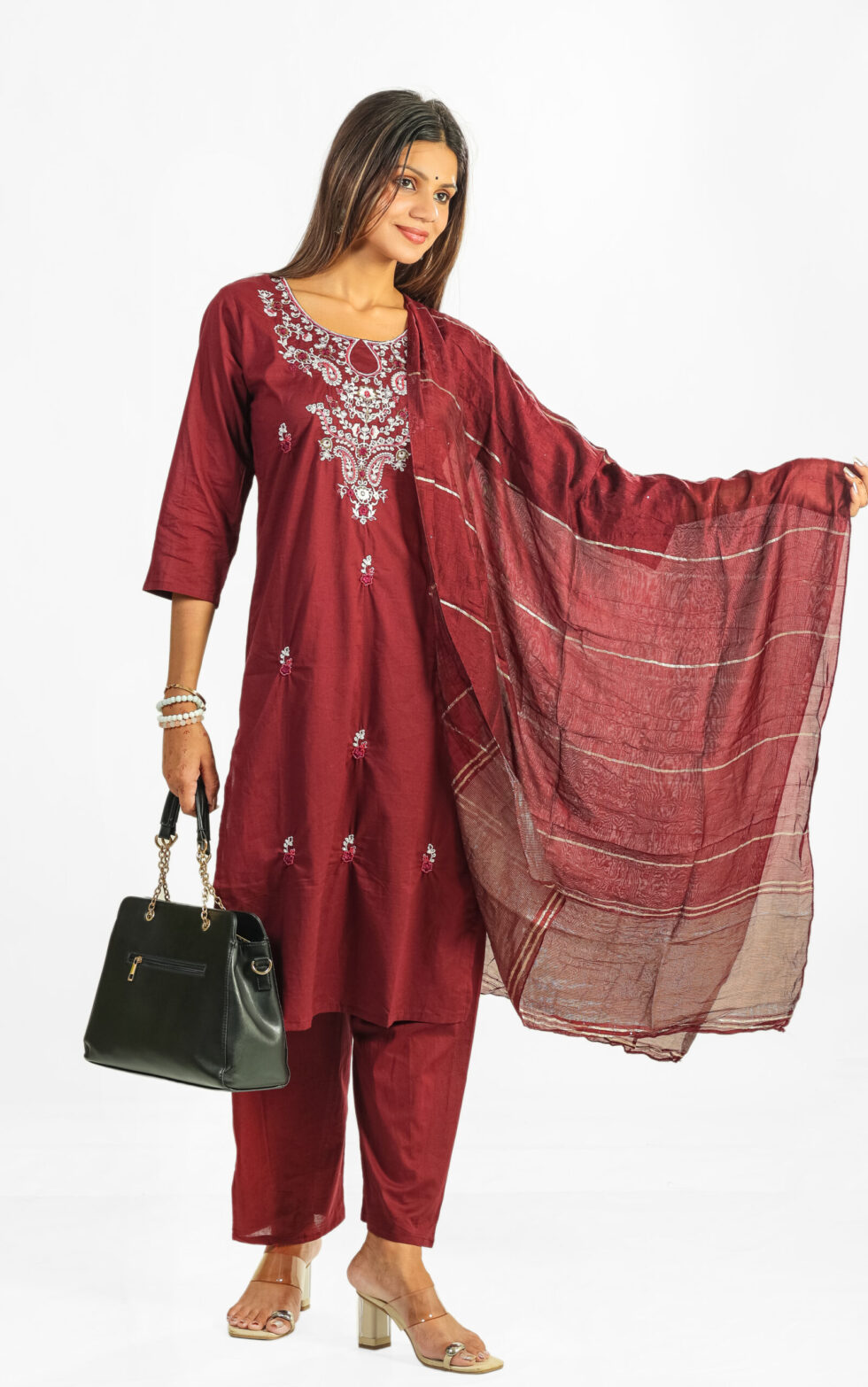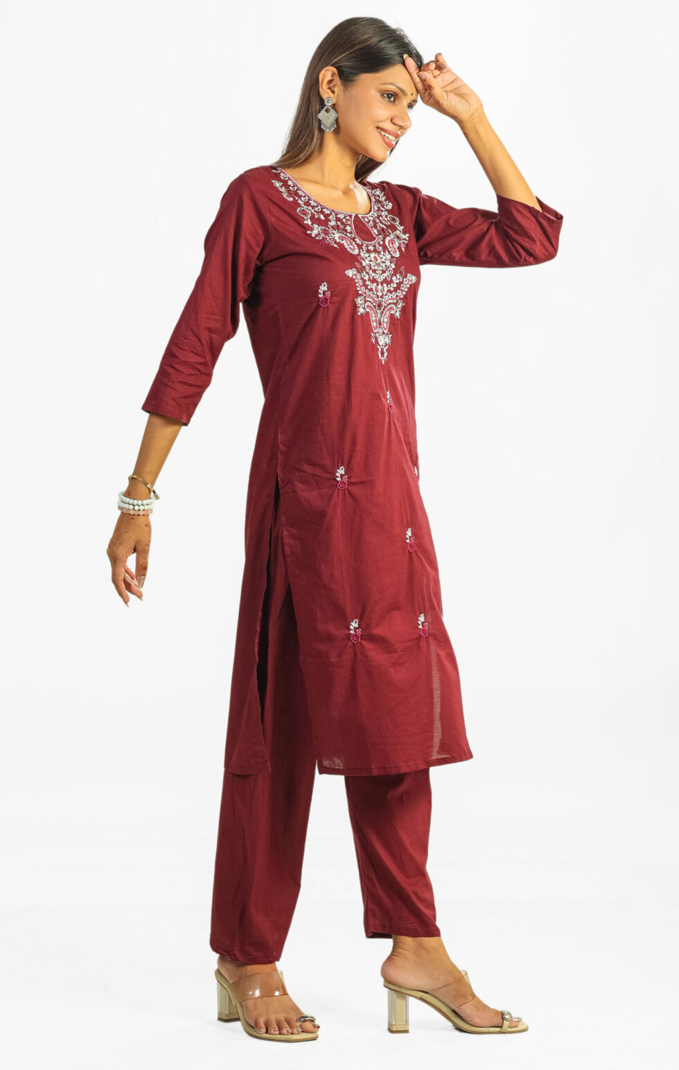 Grace your look with this stunning Maroon Embroidered Cotton Kurta Set, designed to bring out your elegant charm. Crafted from soft cotton fabric, it features exquisite thread embroidery on the neckline and motifs all over, paired with a matching dupatta and pants. Perfect for festive gatherings, office wear, or casual outings, this outfit combines tradition and comfort beautifully. Elevate your ethnic style effortlessly with this classic maroon ensemble.