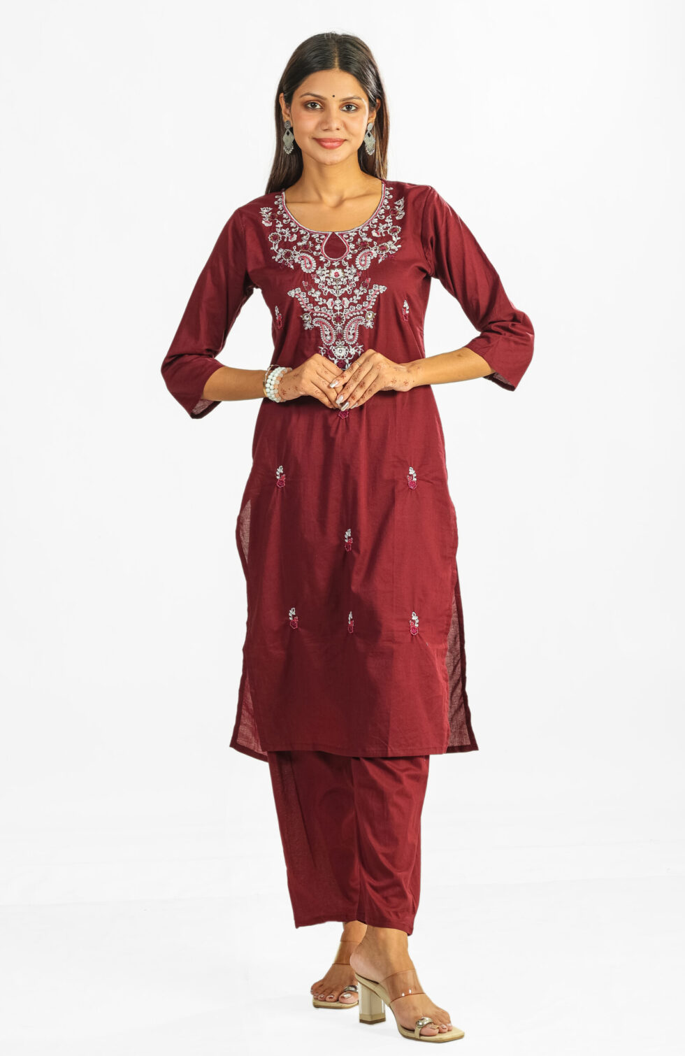 Whether you’re dressing up for festive occasions, family functions, or casual events, this embroidered cotton kurta set ensures a poised and polished look every time. Pair it with statement earrings, heels, and a sleek handbag to complete your elegant ethnic ensemble.