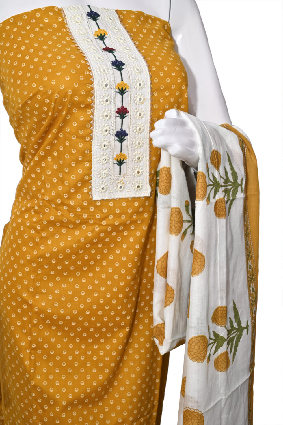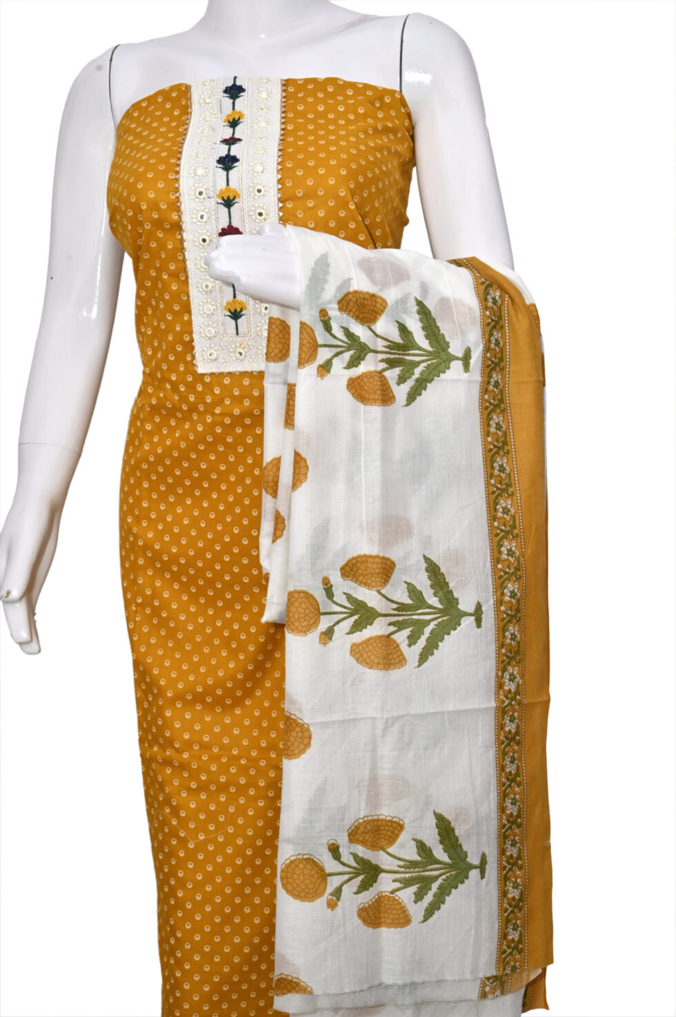 Brighten your ethnic look with this vibrant Mustard Yellow unstitched cotton suit set. It features a micro-print kurta and a beautiful White floral block print dupatta with a bold yellow border. The set includes a contrasting bottom fabric, making it a complete three-piece suit. Perfect for comfortable daily wear and festive daytime events. Shop Block Print Cotton Suits today!