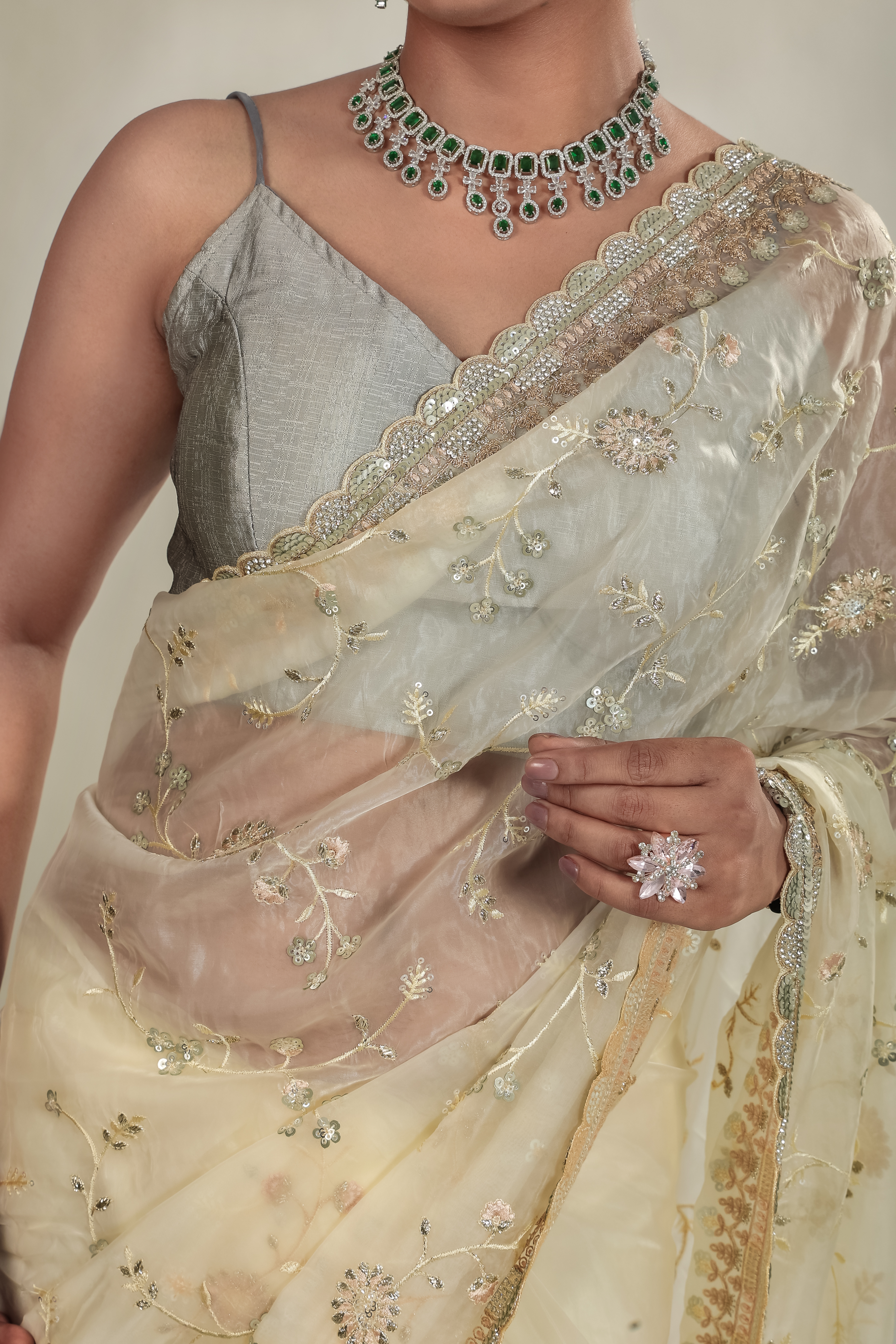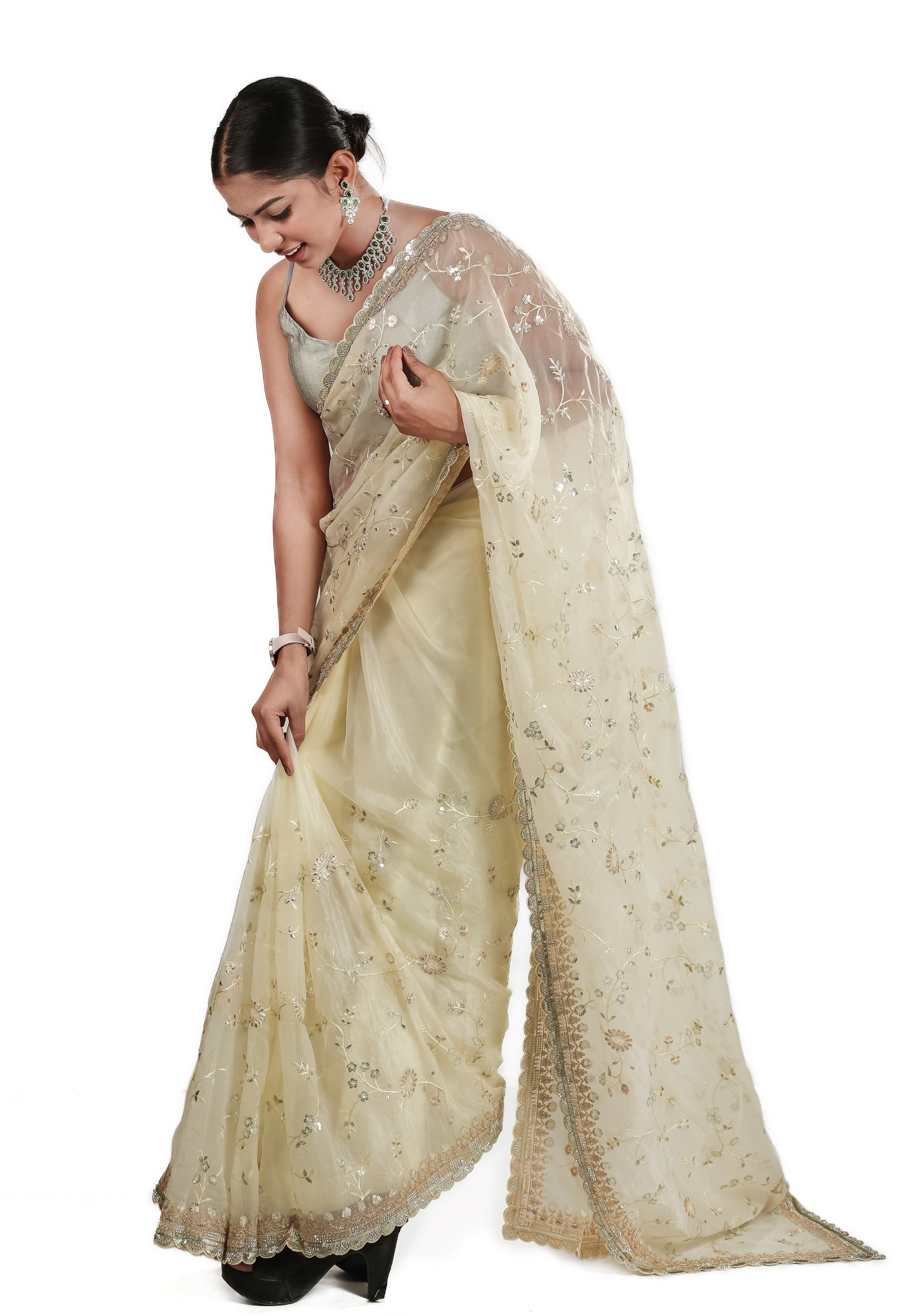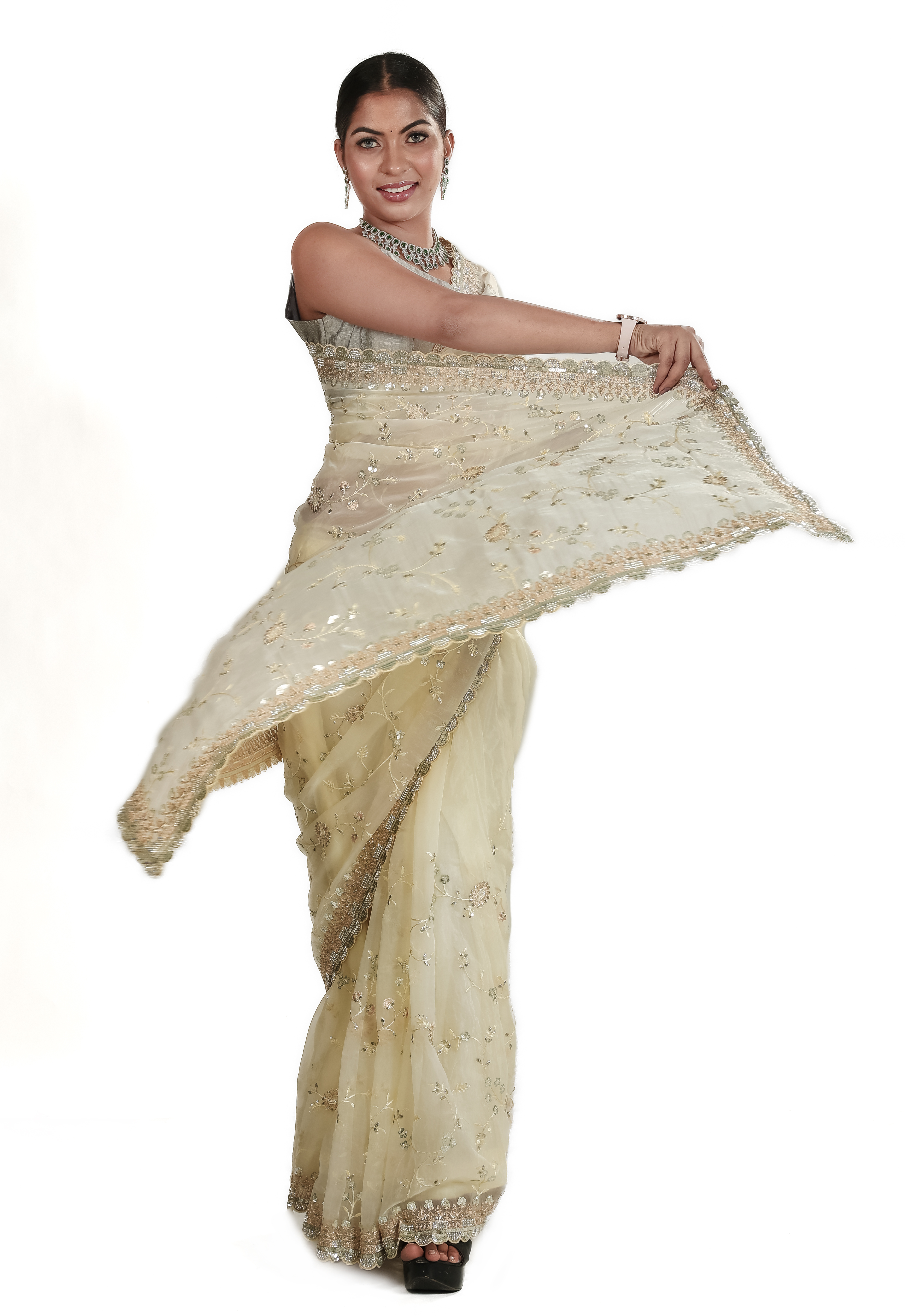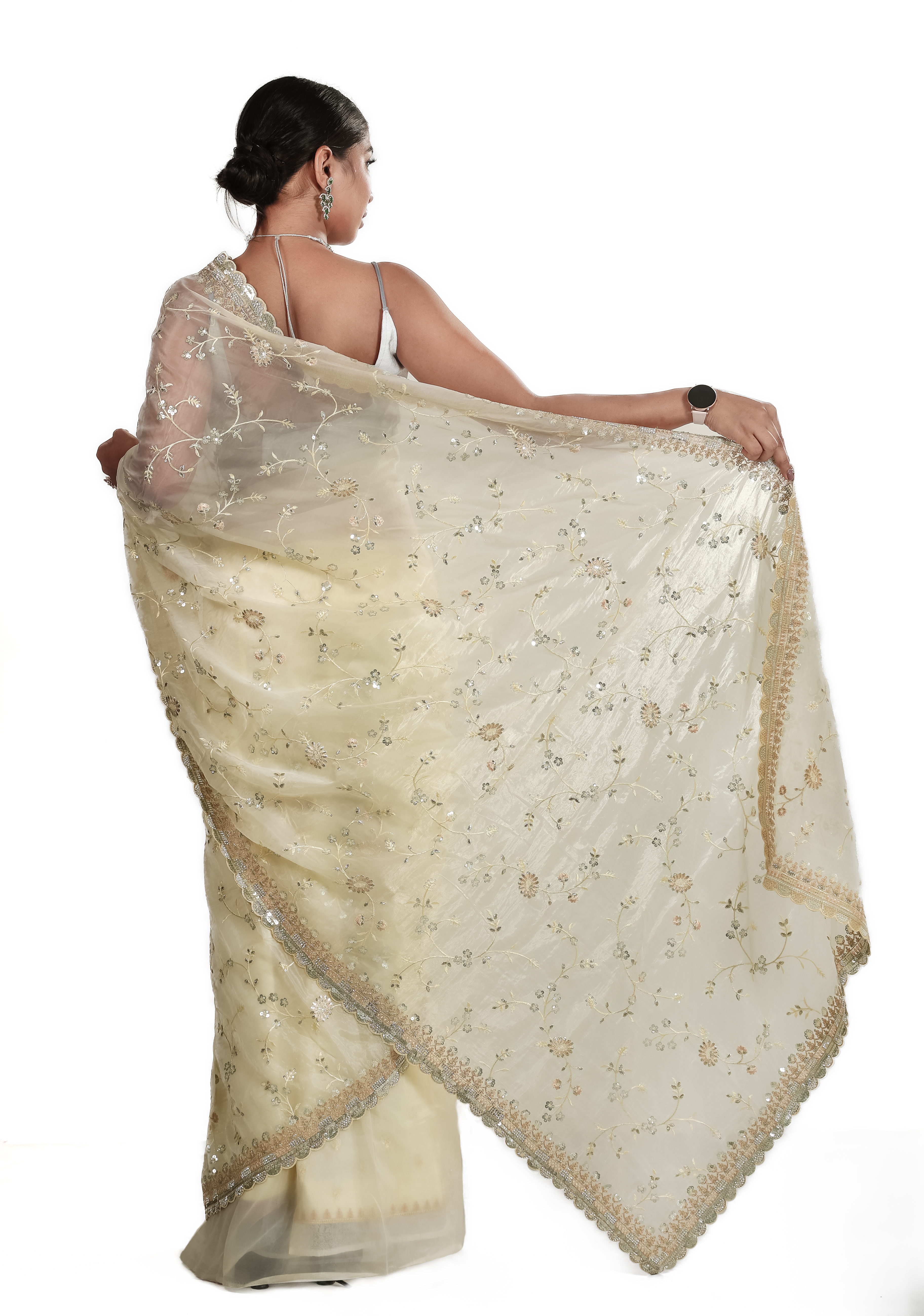 Elevate your ethnic wardrobe with this Premium Cream Net Embroidered Saree, crafted for women who love a blend of elegance and modern charm. The saree features a soft cream net fabric beautifully adorned with delicate floral embroidery and subtle sequin work, giving it a luxurious and festive appeal.