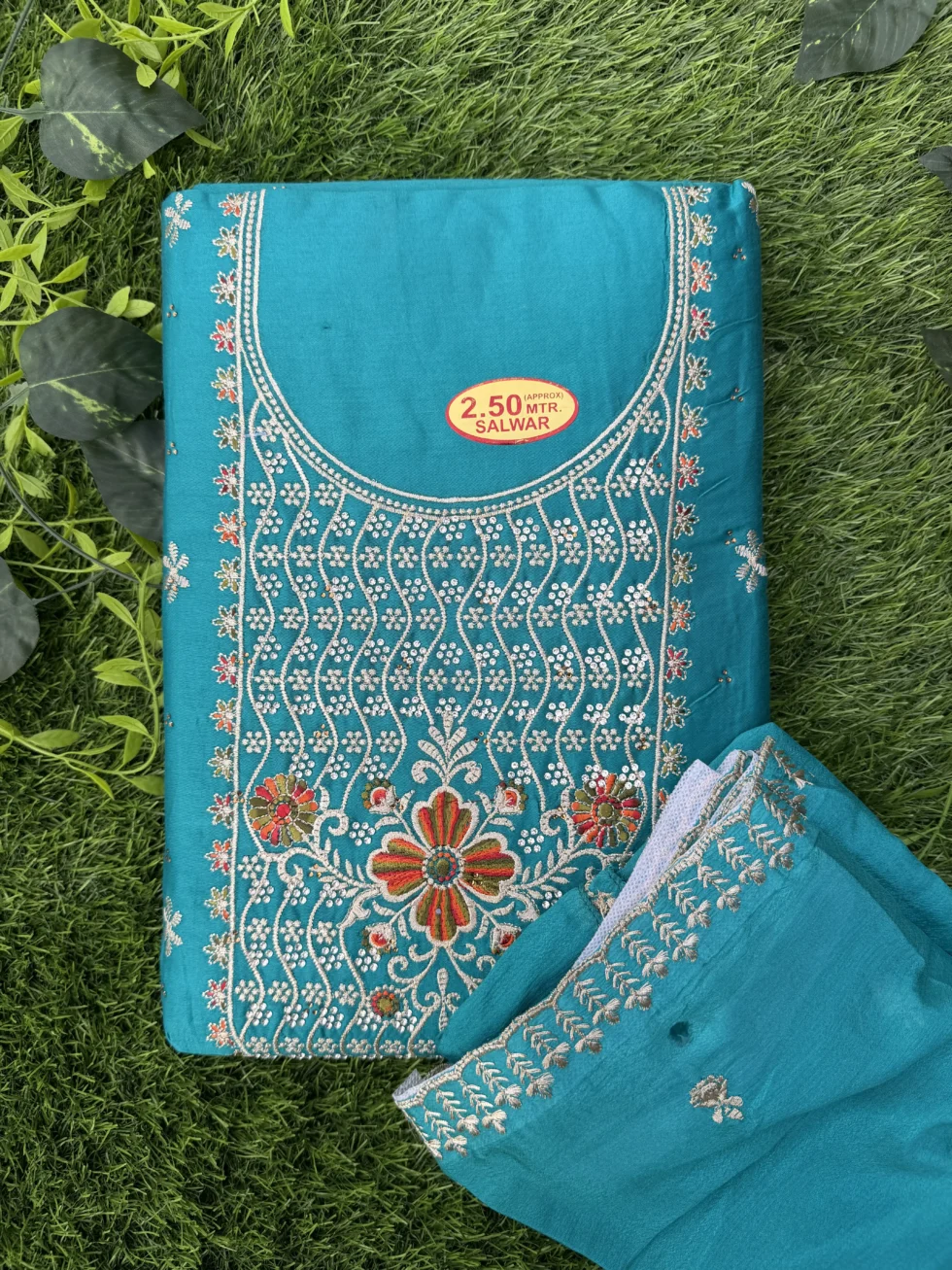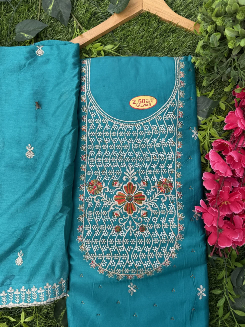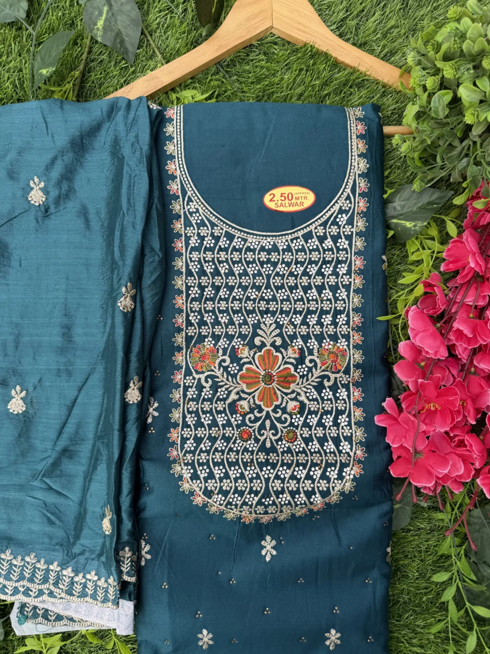 Add timeless elegance to your wardrobe with this premium embroidered unstitched suit set for women. Designed with detailed thread embroidery and delicate floral patterns on the neckline, this dress material reflects traditional craftsmanship with a modern festive touch.