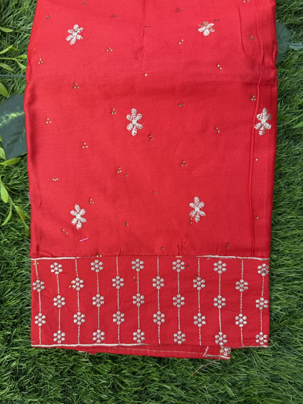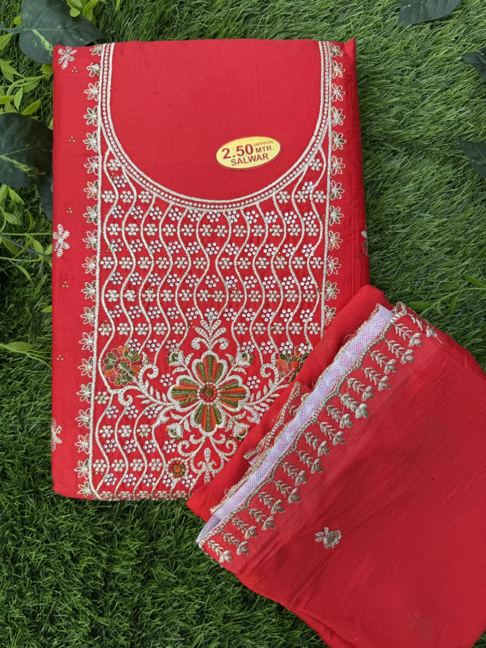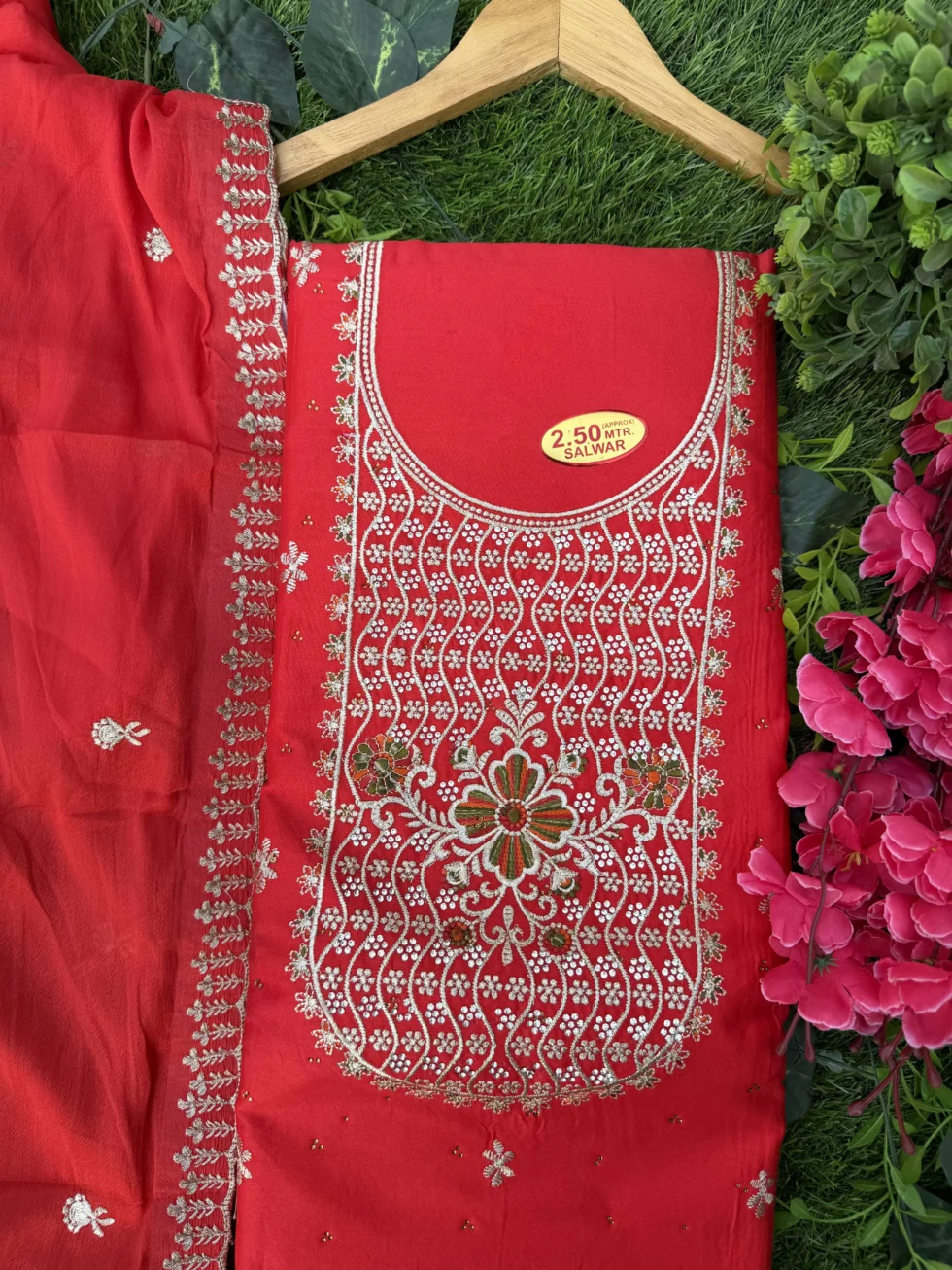 Add timeless elegance to your wardrobe with this premium embroidered unstitched suit set for women. Designed with detailed thread embroidery and delicate floral patterns on the neckline, this dress material reflects traditional craftsmanship with a modern festive touch.