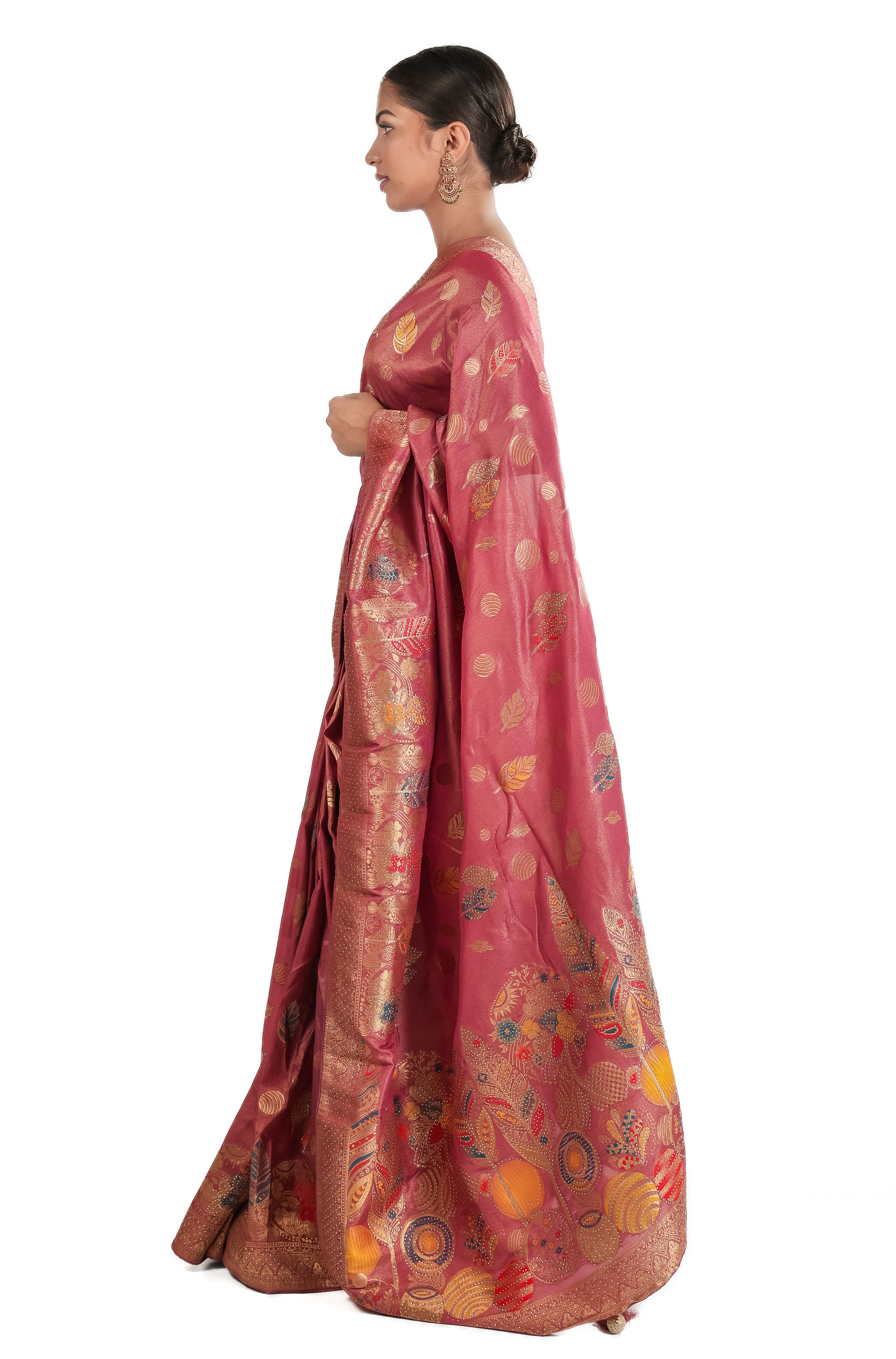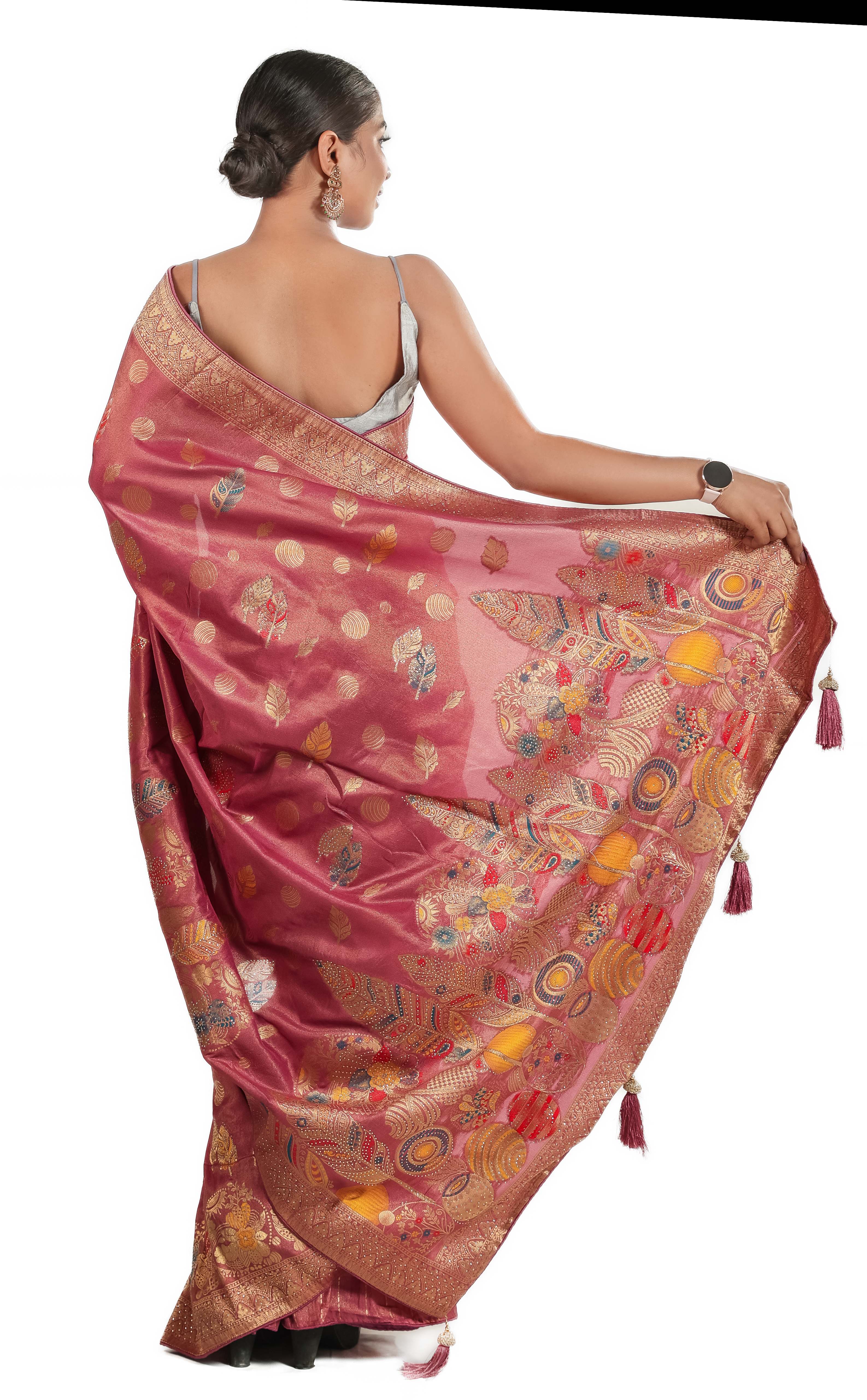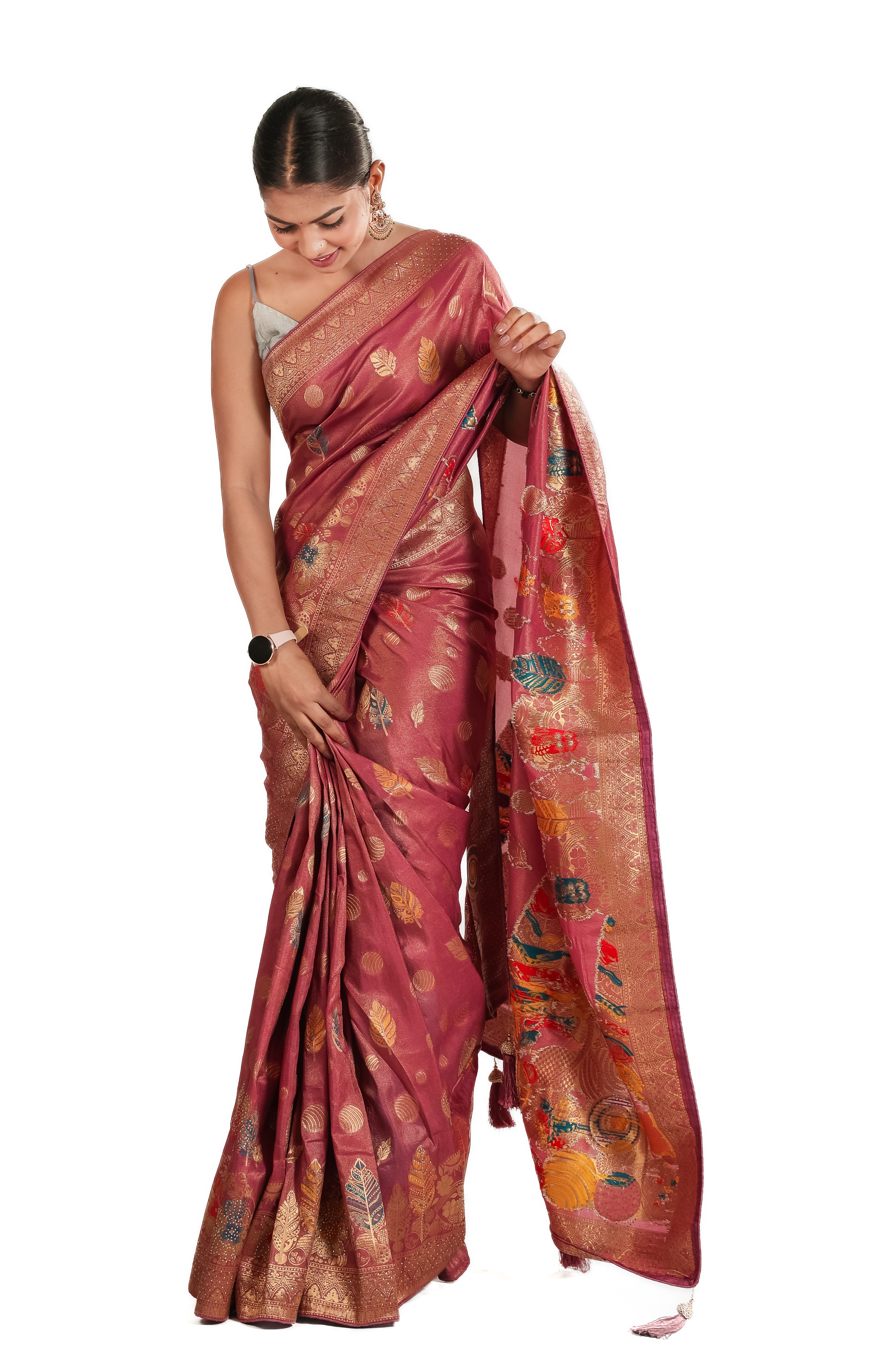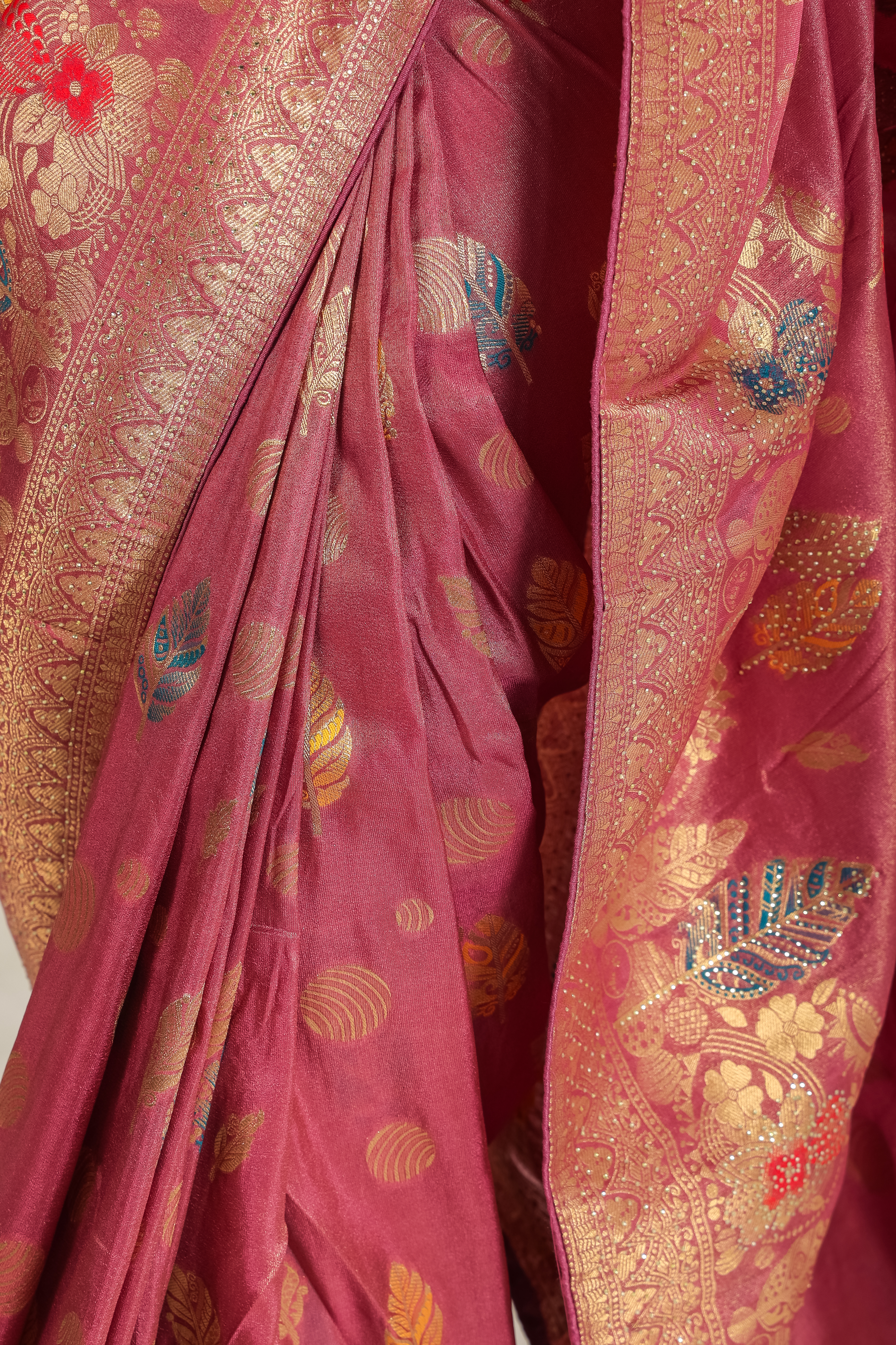 Elevate your ethnic style with this Luxury Wine Zari Weaving Banarasi Saree with Designer Blouse, crafted to bring traditional elegance and modern sophistication together. This stunning saree features rich zari weaving, intricate leaf motifs, and a beautifully textured pallu that adds a royal touch to your festive wardrobe. Made from premium soft fabric, it drapes effortlessly and offers all-day comfort, making it perfect for weddings, parties, festivals, and special cultural events. The detailed golden border enhances its luxurious appeal, while the matching designer blouse adds a stylish finish to the complete look. Whether you want a graceful outfit for a celebration or a timeless saree to elevate your collection, this Banarasi saree is an ideal choice. Shop this Banarasi saree with blouse for a classic, sophisticated, and premium ethnic appearance.