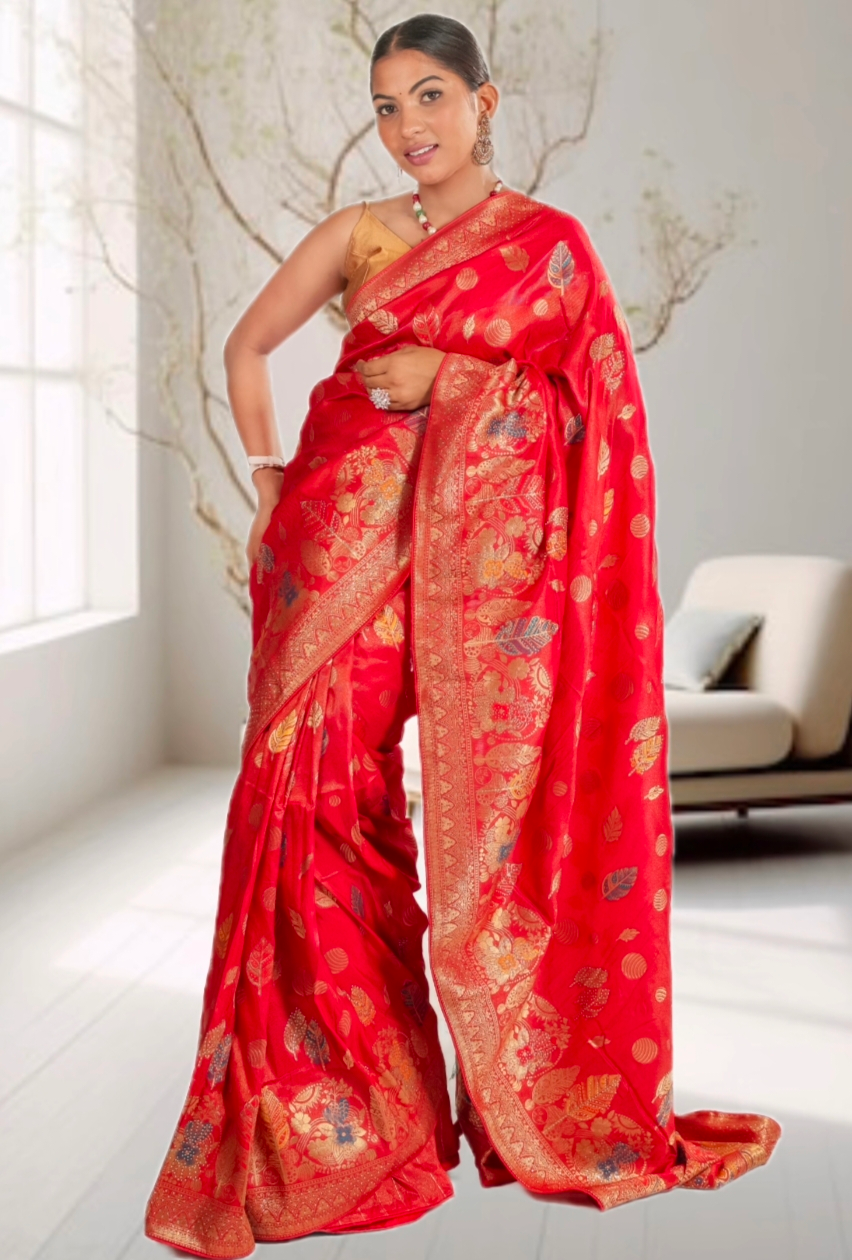 This elegant red Banarasi silk saree with blouse is crafted for women who love rich, traditional Indian fashion. Designed with intricate golden zari weaving, the saree features beautiful feather motifs and circular patterns that enhance its royal appeal. The luxurious silk fabric drapes smoothly and gives a radiant shine, making it perfect for weddings, festivals, parties, and cultural occasions. Its finely detailed border showcases traditional craftsmanship, while the multi-color woven design adds a vibrant touch. The saree comes with a matching blouse piece, allowing you to create a complete festive look with ease. Lightweight, comfortable, and visually stunning, this zari woven saree blends classic beauty with modern elegance. Ideal for gifting or upgrading your ethnic wardrobe, this Banarasi silk saree ensures you stand out with timeless charm and grace.