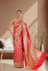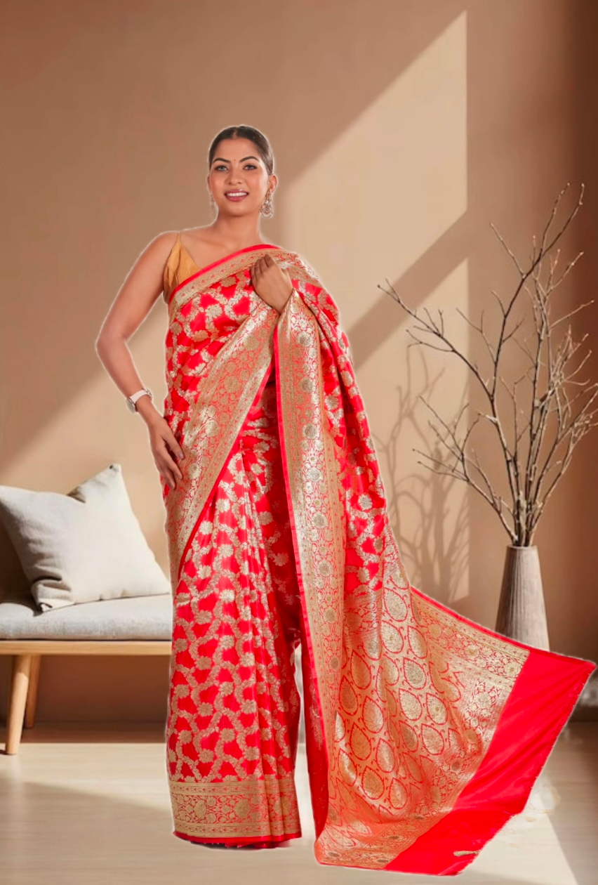 A premium red Banarasi silk saree adorned with intricate golden zari motifs and a beautifully detailed contrasting pallu. Perfect for weddings, festivals, and grand celebrations.