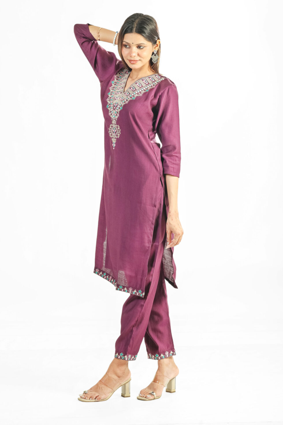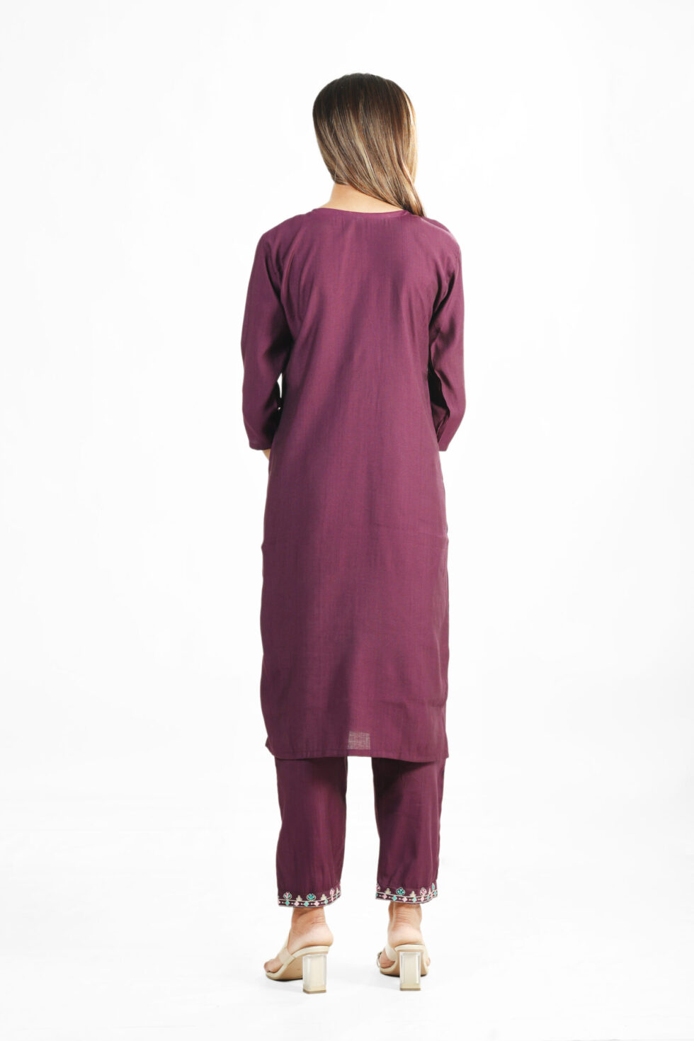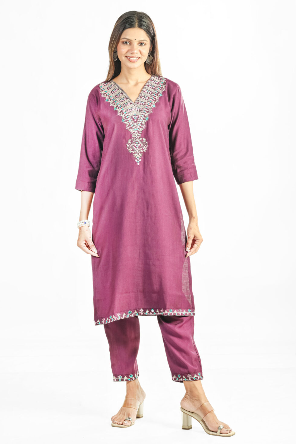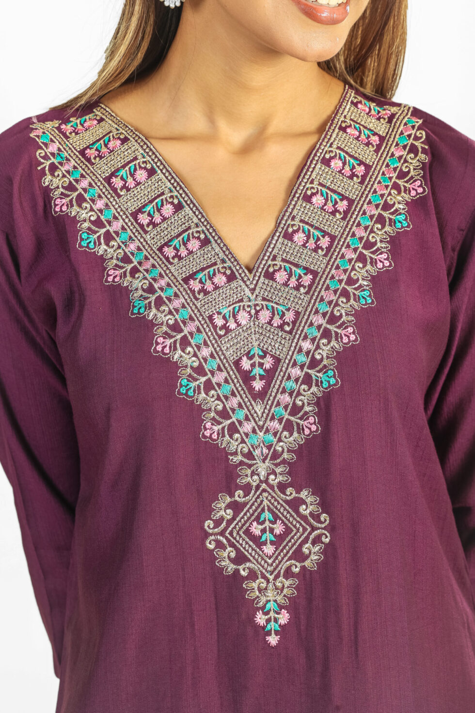 Introducing our stunning Deep Wine Embroidered Kurta Set, a perfect blend of rich color and detailed craftsmanship. The straight-fit kurta is rendered in a luxurious deep wine or plum hue and features eye-catching, multi-colored Kashmiri-style thread and mirror embroidery that beautifully details the V-neckline and yoke. Subtle matching embroidery also adorns the three-quarter sleeves and the ankle of the straight pants, creating a cohesive, finished appearance.