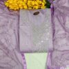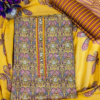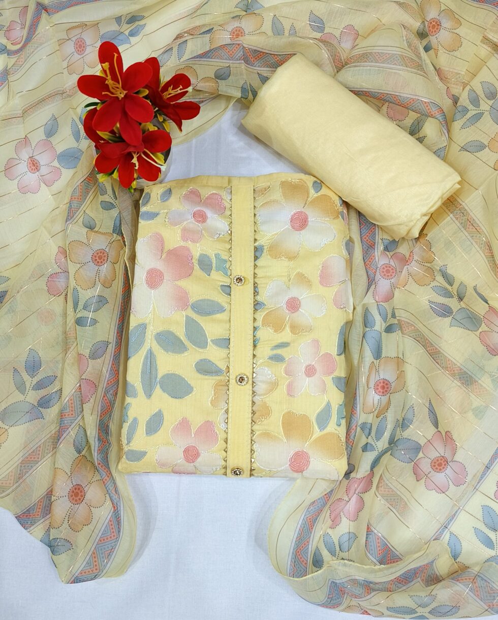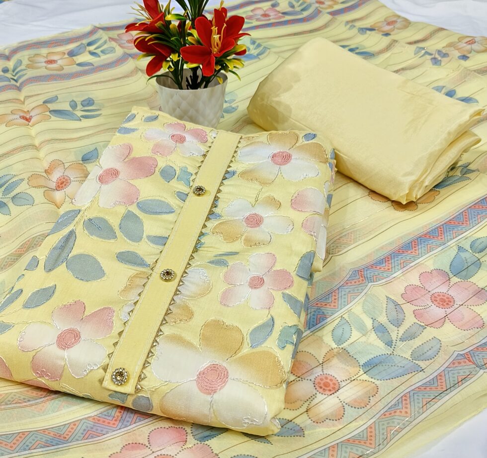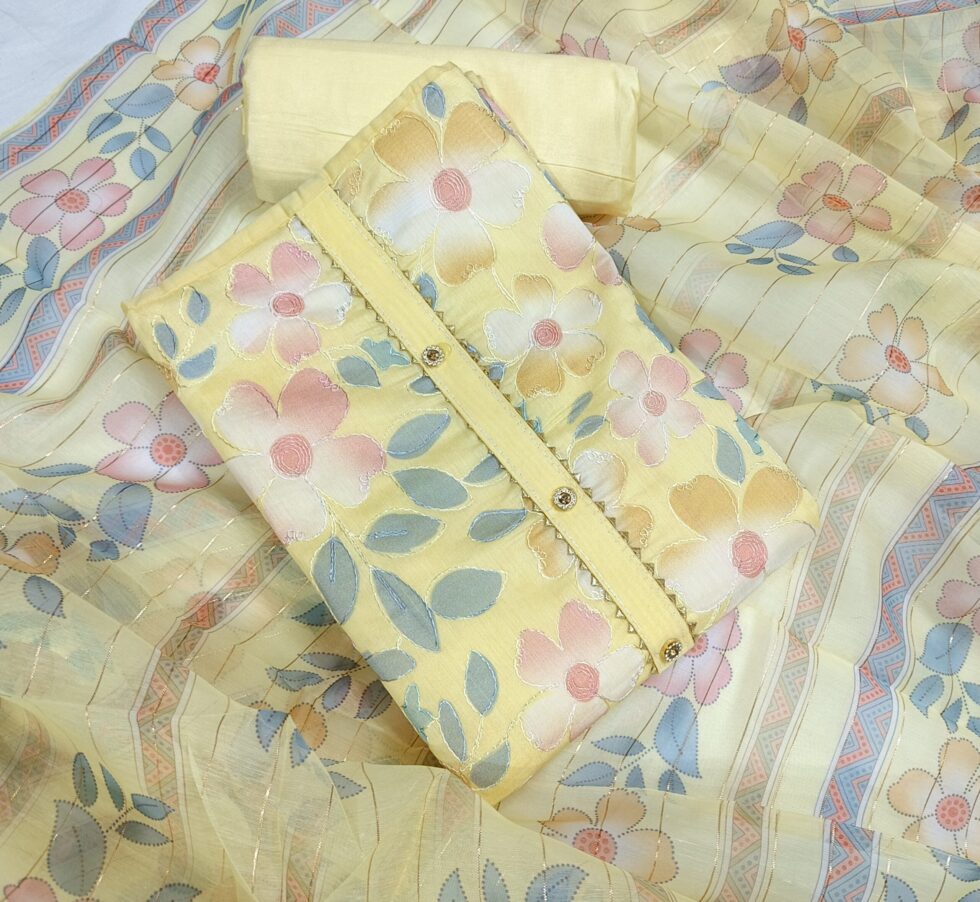 Experience the joyous elegance of our Soft Lemon Yellow and Pink Floral Print Organza Unstitched Suit Material. This charming three-piece set is designed for sophistication and comfort, making it a perfect choice for festive daytime events, summer parties, and refined casual gatherings. The main kurti fabric is crafted in a gentle lemon yellow hue and features a beautiful large floral print in soft pastels like pink, peach, and muted gold, along with subtle blue-green leaves. The flowers appear to be delicately outlined, giving the fabric a rich, textured, or embroidered effect. The central placket is neatly finished with a contrasting trim and small, elegant golden buttons or embellishments, adding a polished touch to the kurti. Complementing the patterned top is a matching plain bottom fabric in a solid lemon yellow or cream color, likely a smooth, textured fabric that balances the richness of the kurti. This versatile bottom fabric can be custom-tailored into trousers, a salwar, or churidar according to your style. The ensemble is completed by a beautiful, sheer Organza dupatta, which is lightweight and airy. The dupatta features a subtle continuation of the floral print along with woven horizontal stripes or geometric borders in coordinating colors, and may include a hint of metallic detail for a festive shimmer. This designer unstitched suit provides the freedom to customize your fit while ensuring a high-end, contemporary look.