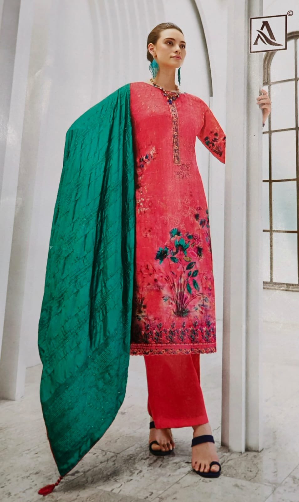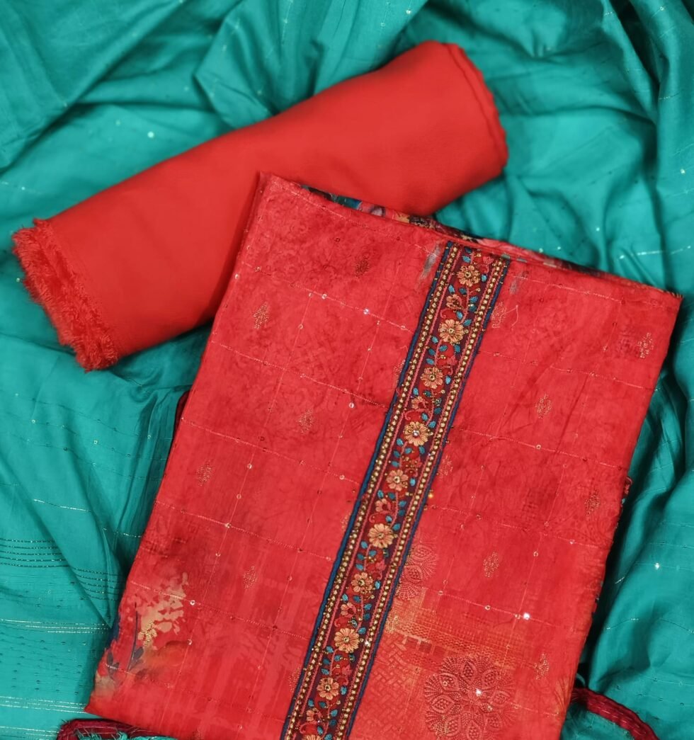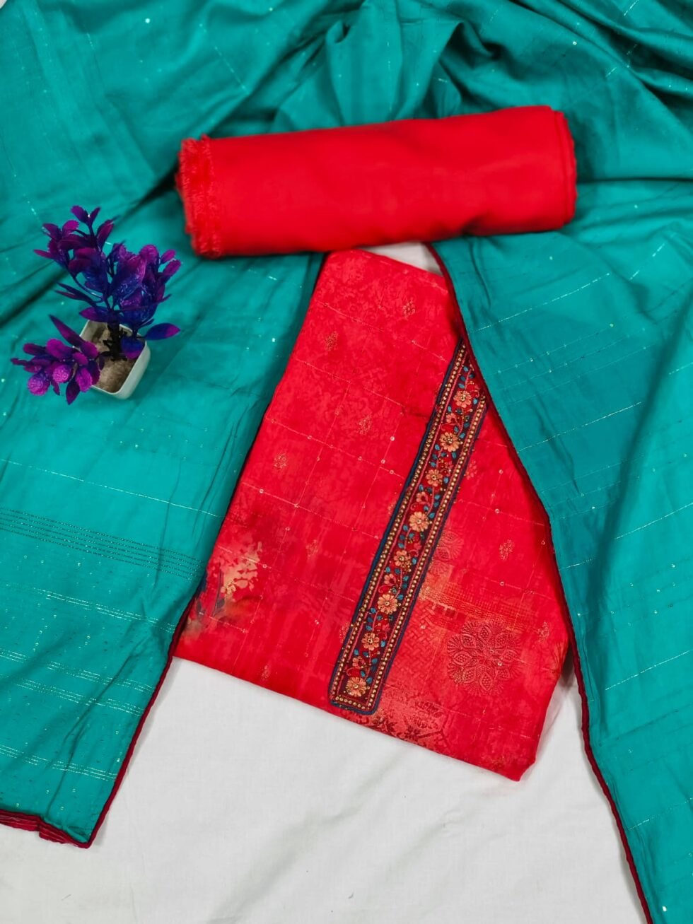 Striking Red and Turquoise Embroidered Unstitched Suit Set