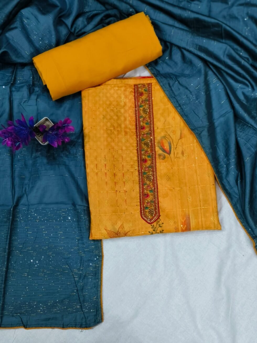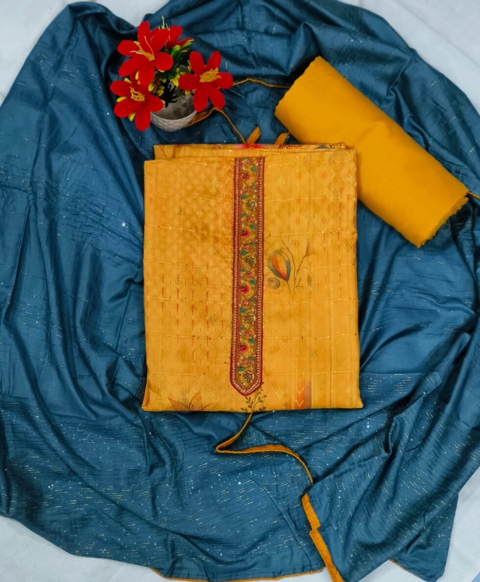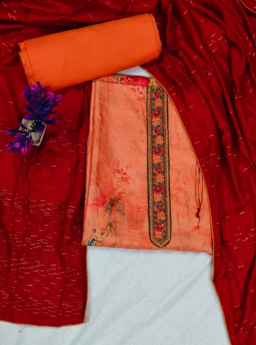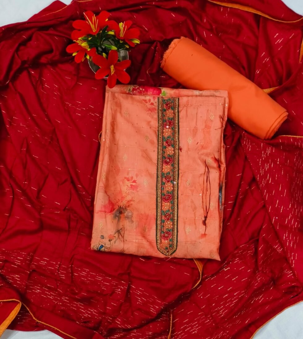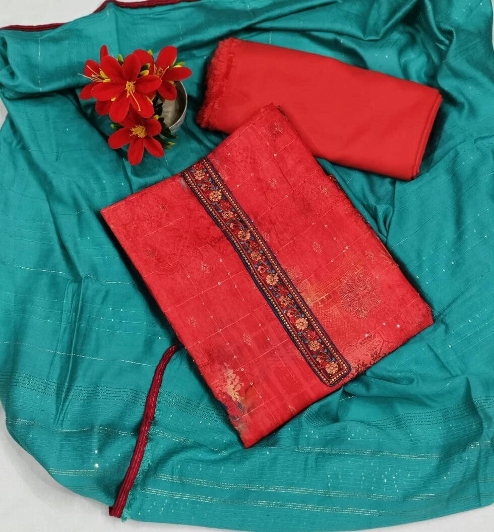Command attention with the dramatic colour pairing of our Striking Red and Turquoise Embroidered Unstitched Suit Set. This gorgeous three-piece ensemble is designed for festive celebrations and special events, offering a perfect blend of bold colour, intricate detailing, and traditional charm. The main kurti fabric is a vibrant deep red with a subtle self-print, texture, or shimmer woven throughout, giving it a rich, luxurious feel. The highlight of the top is the beautifully designed neckline placket, which features intricate multicolour embroidery in shades of blue, gold, and red, adding a sophisticated, finished touch to the kurti. The embroidery is concentrated on the placket, creating an immediate focal point. The set includes a generous length of fabric for the bottom in a solid bright red, which is often a matching material like shantoon or cotton silk, providing a harmonious balance to the patterned top. This versatile bottom can be custom-tailored into a salwar, churidar, or trousers. Completing the bold look is the stunningly contrasting Turquoise blue dupatta. This fabric has a beautiful sheen and features subtle, woven horizontal stripes or texture, possibly with a hint of gold or silver zari, making it shimmer gracefully. The contrast between the deep red and the vibrant turquoise is contemporary and eye-catching. This designer unstitched suit provides the freedom for a customized fit while delivering a high-impact, glamorous ethnic look, perfect for a wedding guest or any grand occasion.