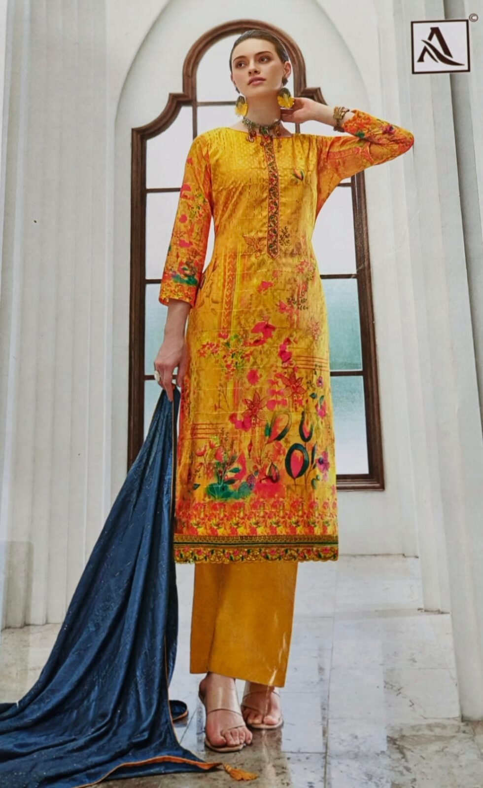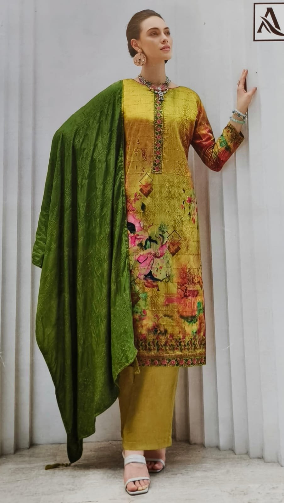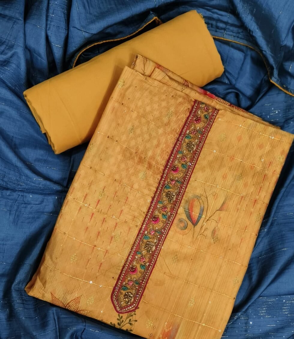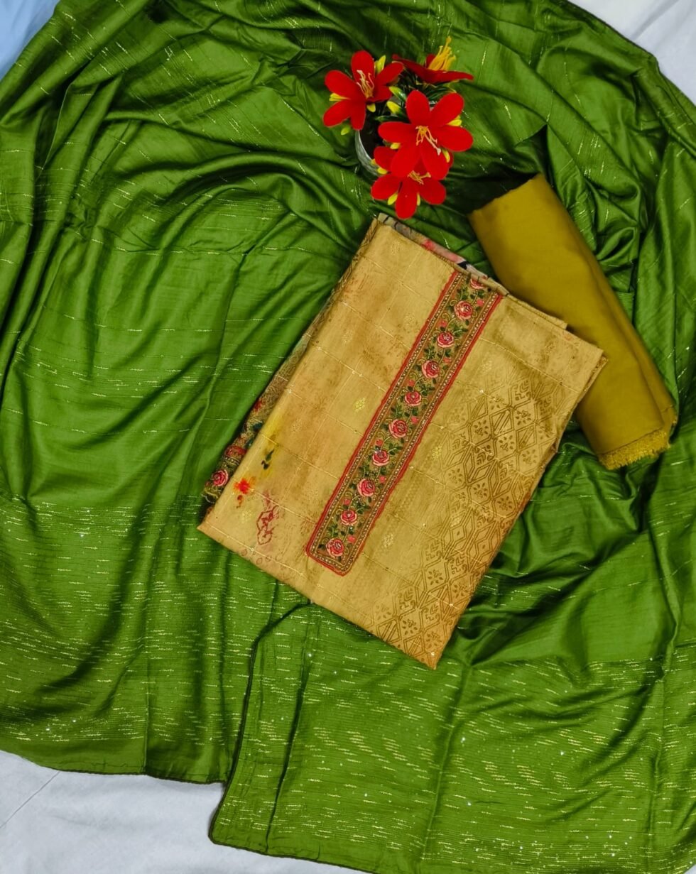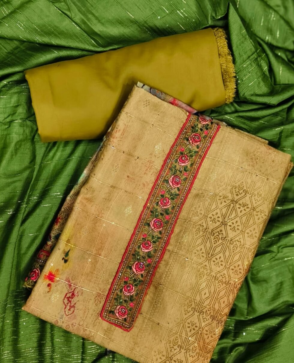 Command attention with the dramatic colour pairing of our Striking Red and Turquoise Embroidered Unstitched Suit Set. This gorgeous three-piece ensemble is designed for festive celebrations and special events, offering a perfect blend of bold colour, intricate detailing, and traditional charm. The main kurti fabric is a vibrant deep red with a subtle self-print, texture, or shimmer woven throughout, giving it a rich, luxurious feel. The highlight of the top is the beautifully designed neckline placket, which features intricate multicolour embroidery in shades of blue, gold, and red, adding a sophisticated, finished touch to the kurti. The embroidery is concentrated on the placket, creating an immediate focal point. The set includes a generous length of fabric for the bottom in a solid bright red, which is often a matching material like shantoon or cotton silk, providing a harmonious balance to the patterned top. This versatile bottom can be custom-tailored into a salwar, churidar, or trousers. Completing the bold look is the stunningly contrasting Turquoise blue dupatta. This fabric has a beautiful sheen and features subtle, woven horizontal stripes or texture, possibly with a hint of gold or silver zari, making it shimmer gracefully. The contrast between the deep red and the vibrant turquoise is contemporary and eye-catching. This designer unstitched suit provides the freedom for a customized fit while delivering a high-impact, glamorous ethnic look, perfect for a wedding guest or any grand occasion.