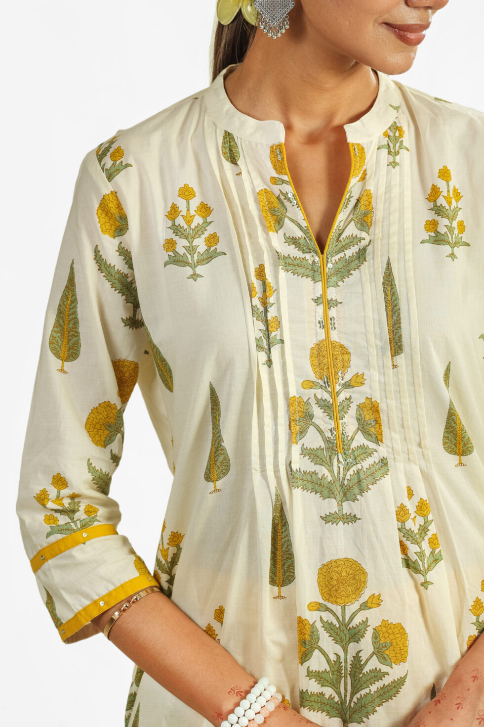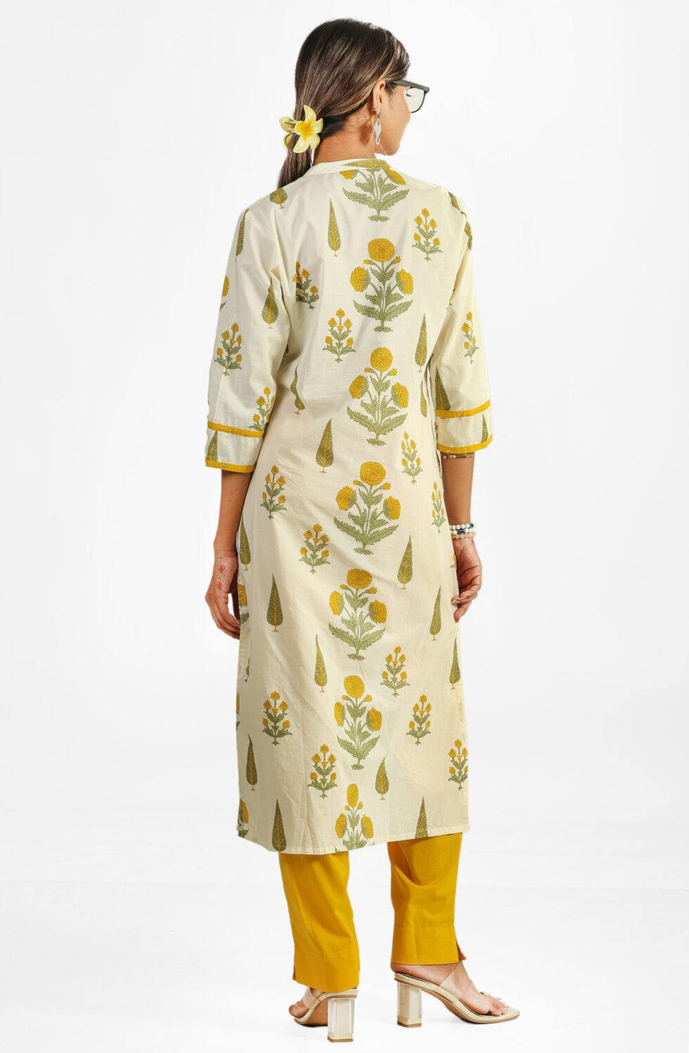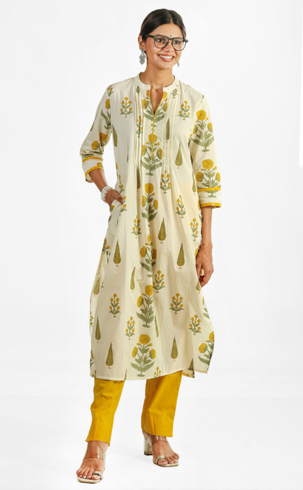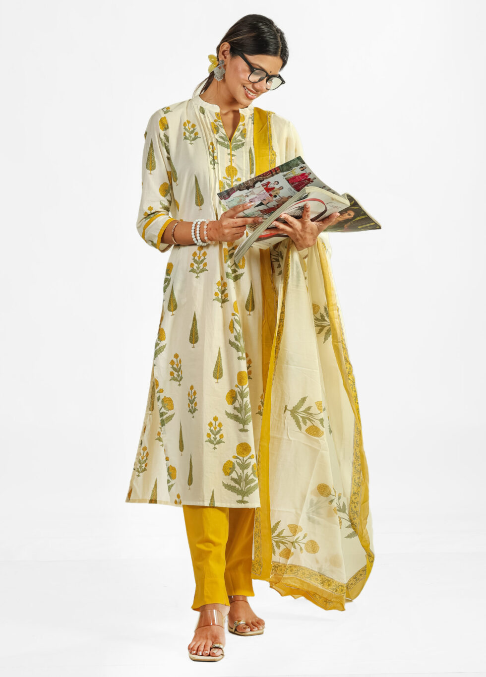This cheerful yellow and cream kurta set features a flattering Anarkali silhouette with traditional hand block prints. It’s perfectly paired with solid yellow pants and a matching printed dupatta. An ideal choice for daytime events and comfortable ethnic style.