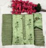 Design your perfect outfit with this beautiful Unstitched Three-Piece Cotton Suit Fabric. The kurta fabric comes in a soothing pistachio green base, featuring a delicate vertical striped texture overlaid with charming botanical/floral motifs. The neckline area is detailed with an intricate printed or embroidered-look yoke design, ready to be highlighted when stitched.