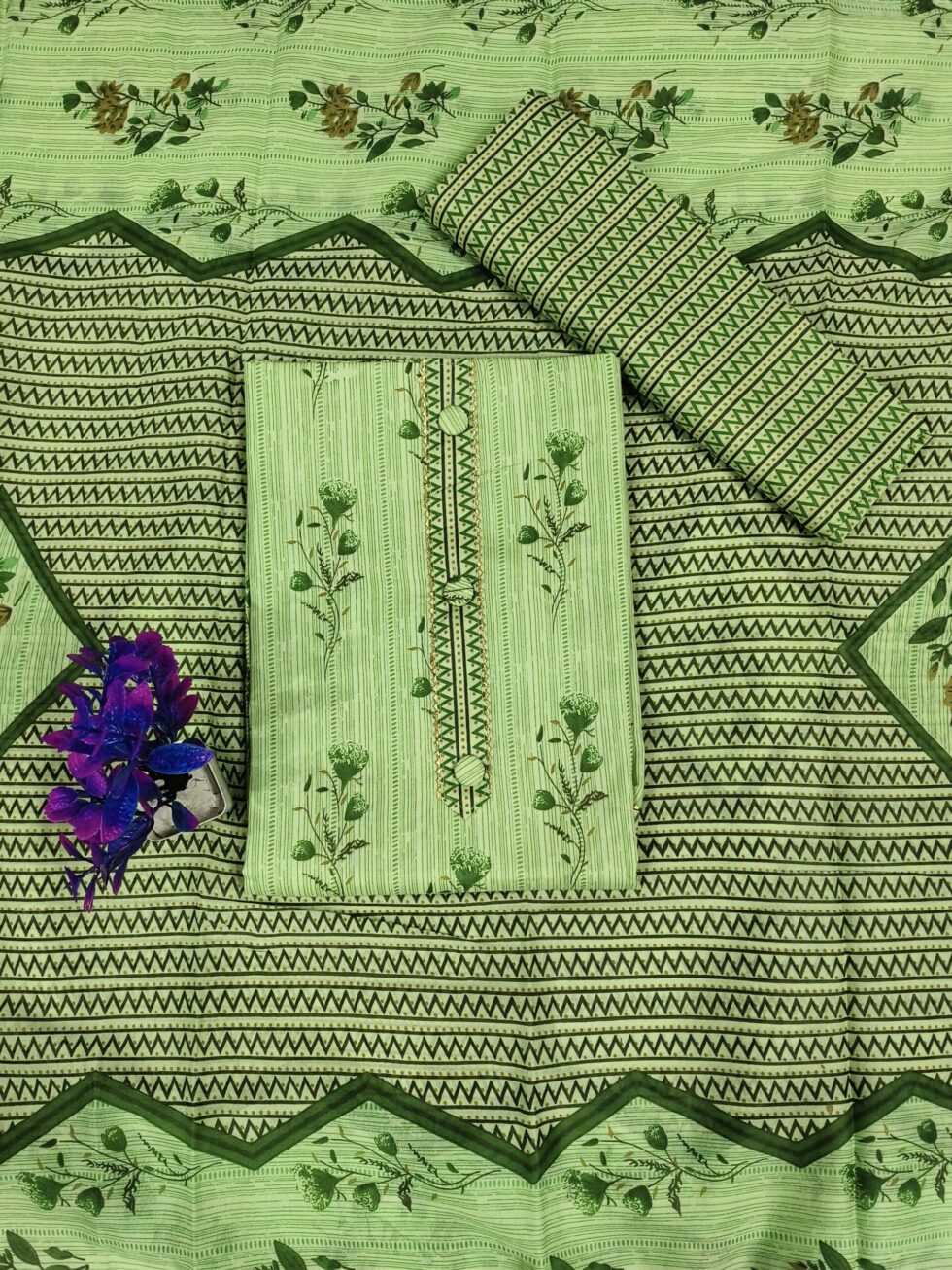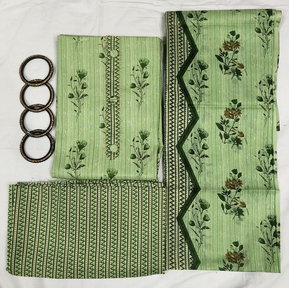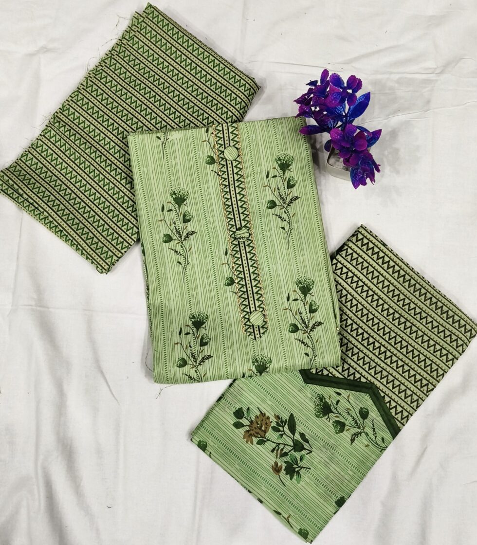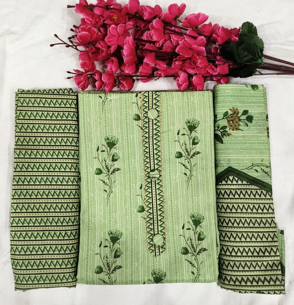 Be the first to review “Unstitched Pistachio Green Printed Cotton Suit Fabric with Striped Bottom and Printed Dupatta”