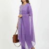 This is an elegant unstitched cotton suit set in a fresh pistachio green. It includes fabric for a printed kurta with a yoke pattern, coordinating striped bottom fabric, and a matching printed dupatta. Perfect for customized summer ethnic wear.