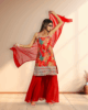 Make a bold statement with this vibrant red gharara set. It features a strappy kurta with a striking tropical print and intricate sequin/bead embroidery along the hem. Paired with flowing red wide-leg gharara pants and a matching chiffon dupatta. Perfect for festive occasions.