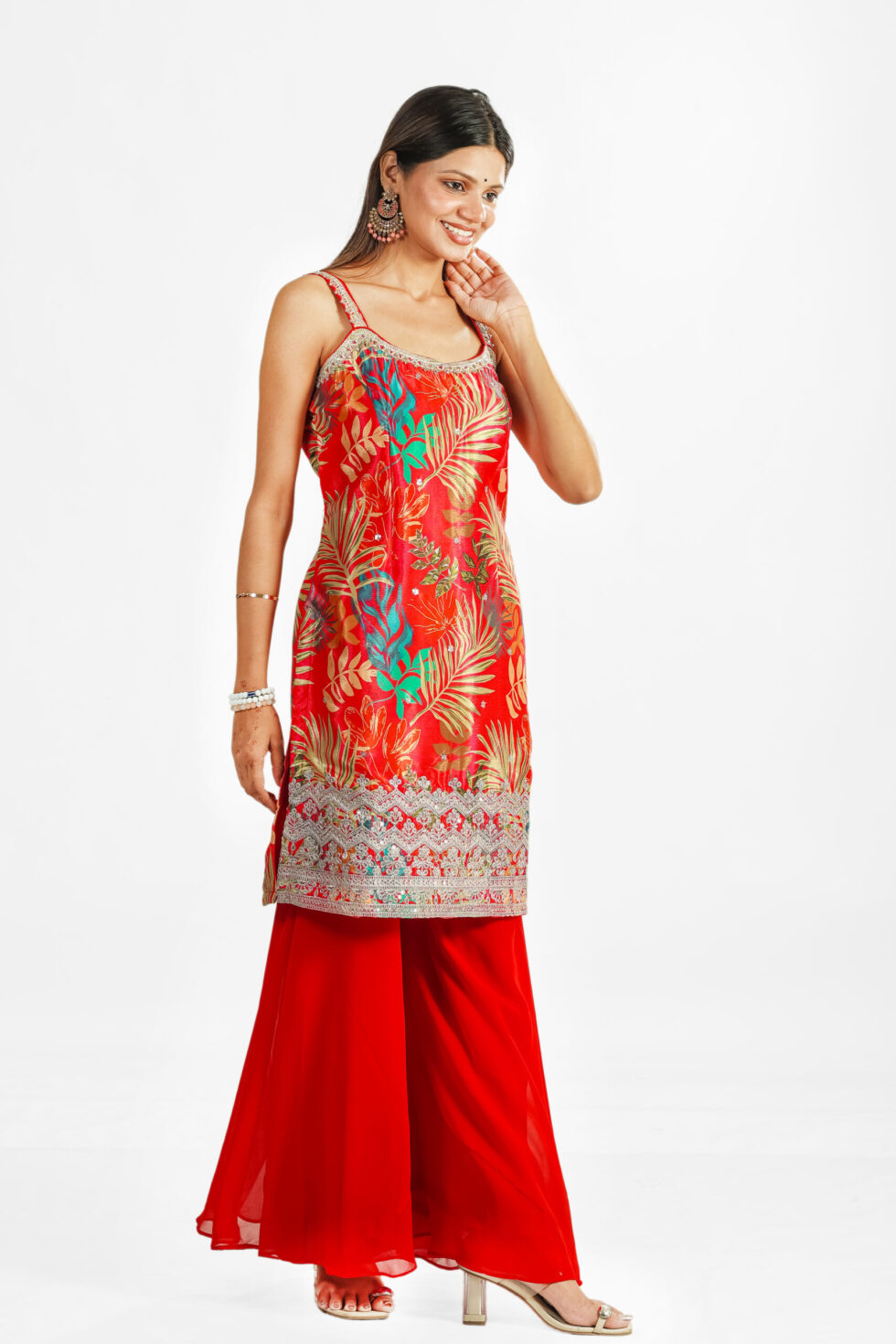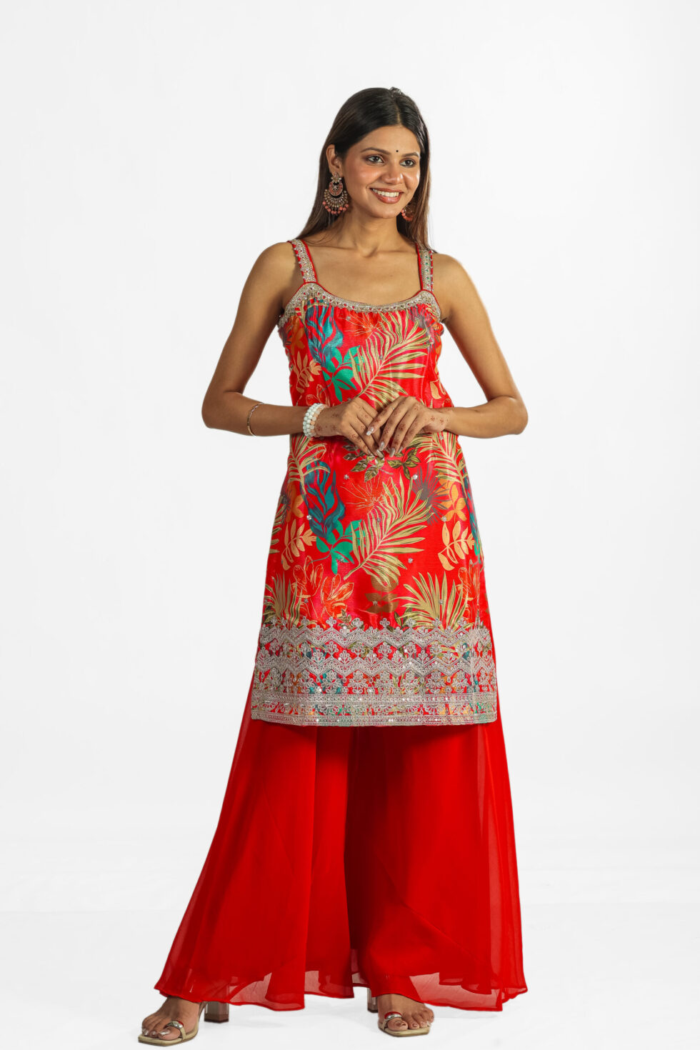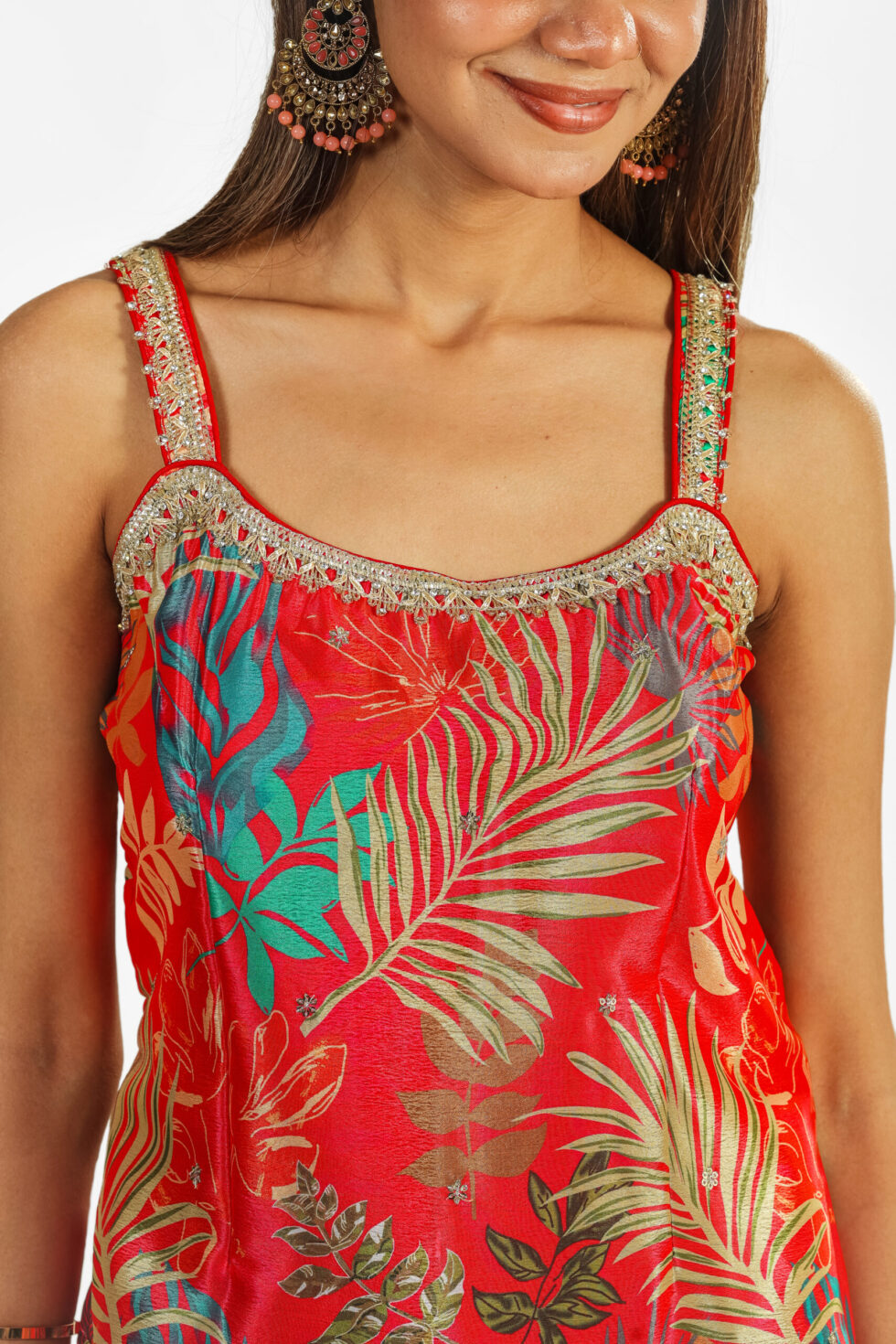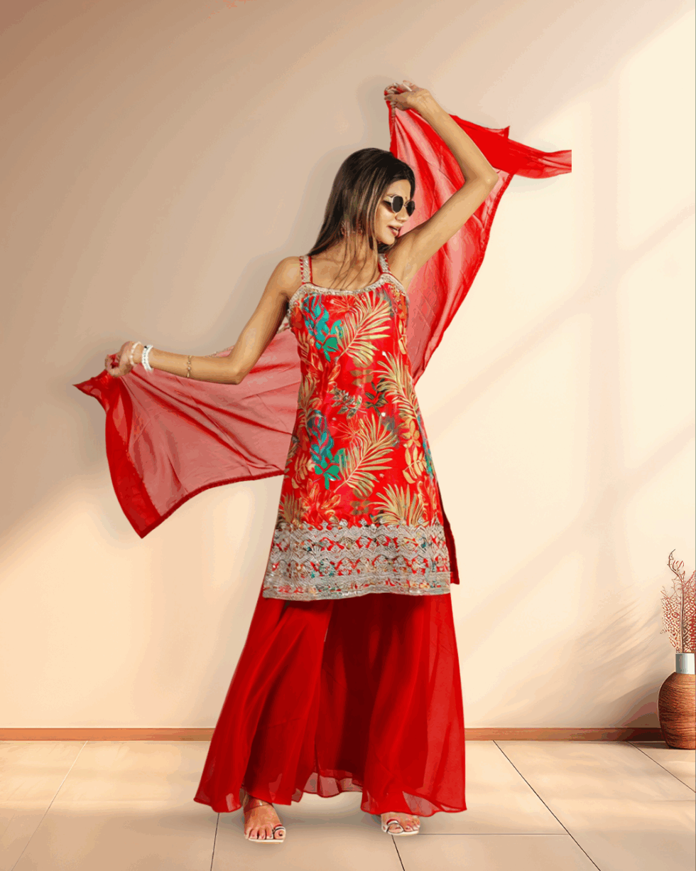 Vibrant Red Tropical Print Strappy Kurta Set with Embroidered Gharara & Chiffon Dupatta