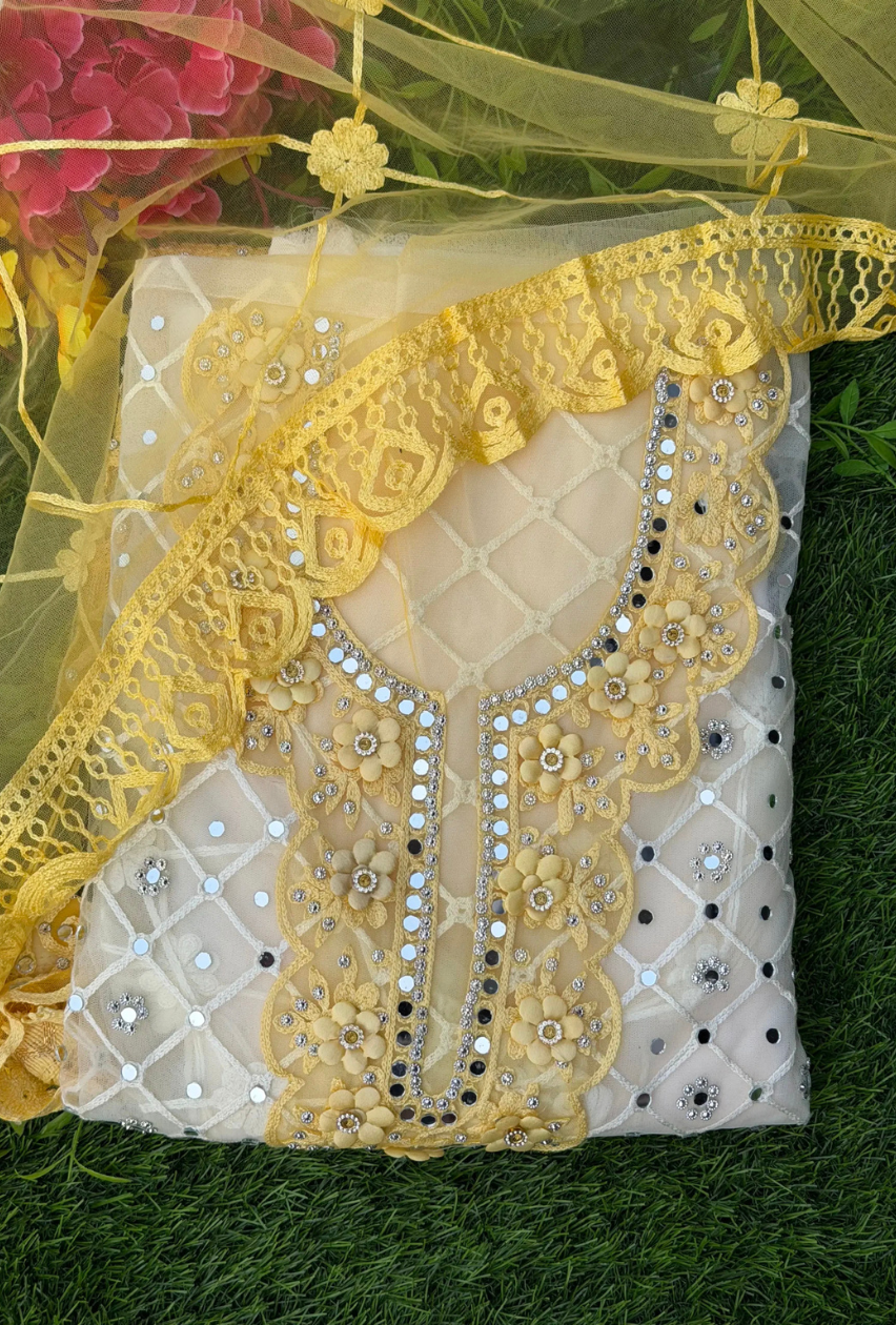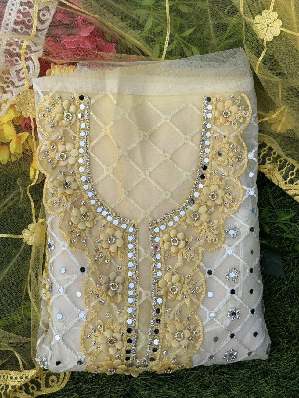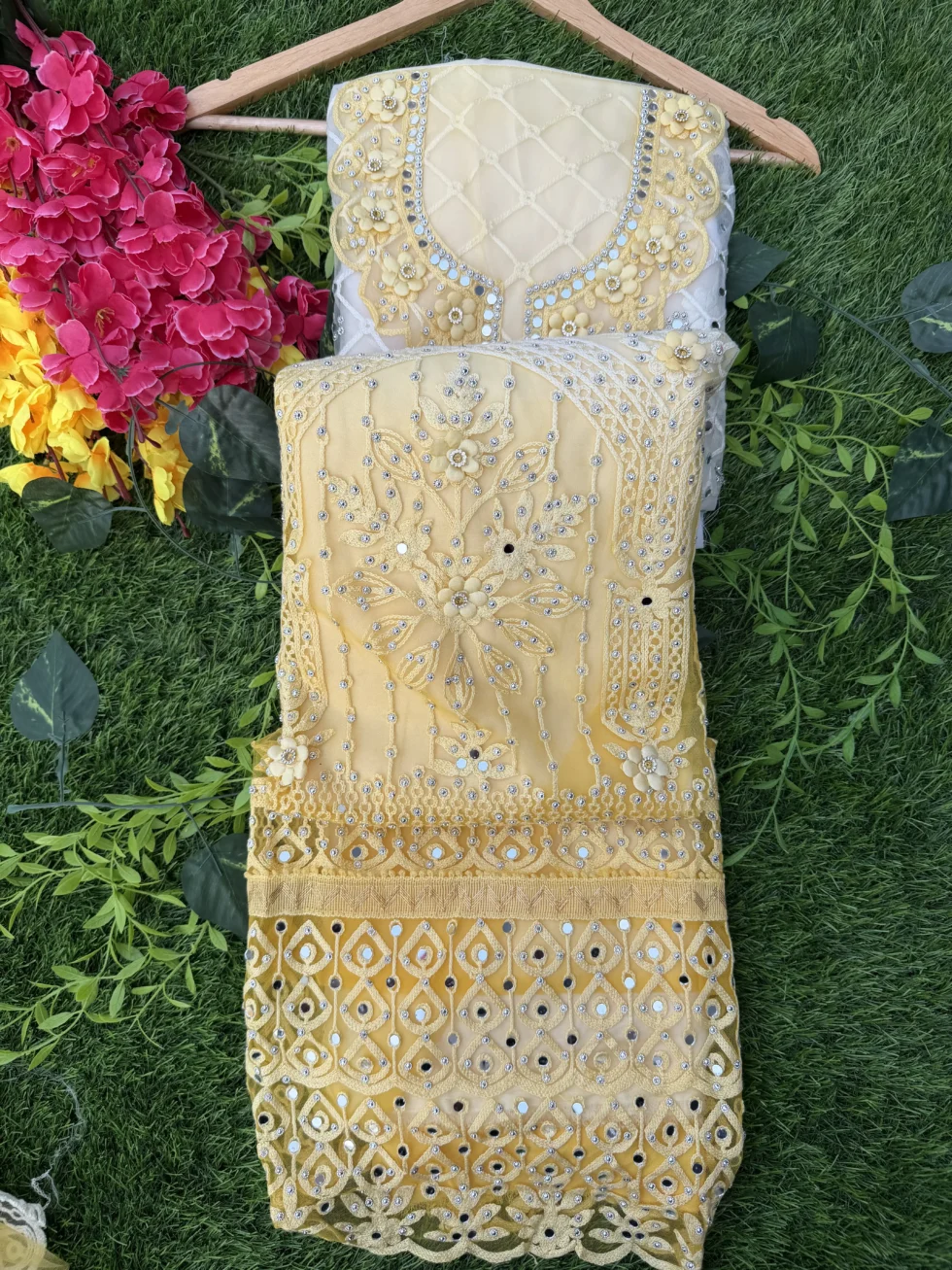 Enhance your ethnic wardrobe with this stunning Yellow Net Darwaza Style Heavy Embroidered Unstitched Suit Set. Designed with intricate embroidery, delicate floral patterns, sequins, and stone work, this suit set offers a rich and elegant festive look. The beautiful Darwaza style front design adds a traditional designer touch, making it perfect for special occasions.